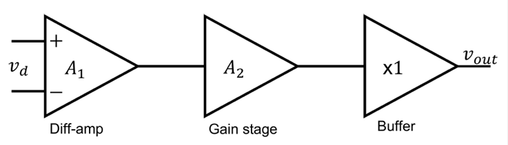 El desarrollo de circuitos Integrados (CIs) con tecnologías manométricas es un reto para todo diseñador. Es así porque cada día hay una demanda adicional en el desempeño de los circuitos y sistemas de las nuevas aplicaciones, sean para su inclusión en el desarrollo de circuitos para la exploración espacial, en los nuevos procesadores, en el desarrollo de sensores inteligentes, en dispositivos portátiles, para ser parte de las Tecnologías de la Información (TI) y/o el Internet de las Cosas (IC), por citar algunas [1-3]. Aún más, el diseño de circuitos analógicos se vuelve una tarea multi-objetivo por las nuevas tendencias que apuestan a la reducción en los voltajes de alimentación sin degradar la eficiencia de los sistemas, con mayores frecuencias de operación, con reducido consumo de potencia y del área de integración y operación en un amplio rango de temperatura, entre otros. En el diseño analógico, su objetivo es mapear las restricciones de acondicionamiento de señales en bloques de circuitos electrónicos que cumplan con las especificaciones de las distintas aplicaciones. Un ejemplo puede verse en la Fig. 1, donde se muestra el diagrama a bloques de un amplificador de dos etapas con buffer de salida. La primer etapa es un amplificador diferencial [4] y enseguida una etapa de ganancia que puede ser de mayor ganancia que la primer etapa, y por último un buffer. Si el amplificador es condicionado para manejar cargas capacitivas, el buffer no se requiere. Pero, si es condicionado para manejar cargas resistivas o cargas RC, se utiliza un buffer [5].