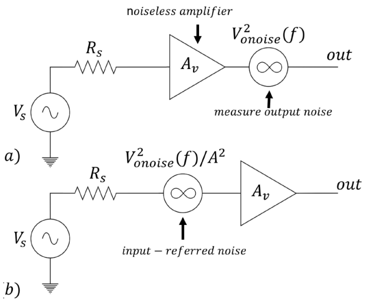 90 % = 14.46 ns, con lo cual se puede determinar que SR = 22.70 V/μs. Otro parámetro importante que puede ser analizado mediante simulación es el ruido intrínseco. Como sabemos, en muchas aplicaciones como amplificadores de audio, filtros y convertidores de datos, el ruido puede ser un factor limitante de diseño [5,16]. Un parámetro de interés es el ruido referido a la entrada (IRN, por sus siglas en inglés), el cual representa todas las fuentes de ruido intrínsecas en el circuito como una sola fuente a la entrada. En sentido estricto el ruido es medido a la salida del circuito, sin embargo, éste puede ser referido a la entrada para ser comparado con una señal de entrada. Cabe señalar que el ruido referido a la entrada no está realmente presente en la entrada del circuito bajo prueba, esta representación puede verse en la Fig. 10 [5]. En la Fig. 10a) se considera que el amplificador no genera ruido, por lo tanto, el ruido total del sistema está representado por la potencia de ruido