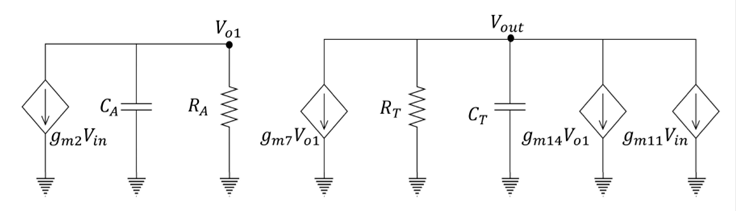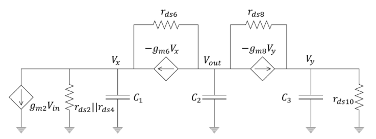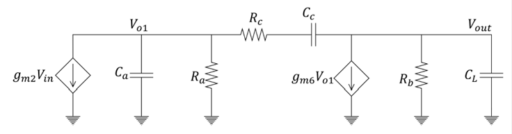 Figura 4 Circuito equivalente en pequeña señal del amplificador Miller; los transistores operan en saturación y polarizados en fuerte inversión.
