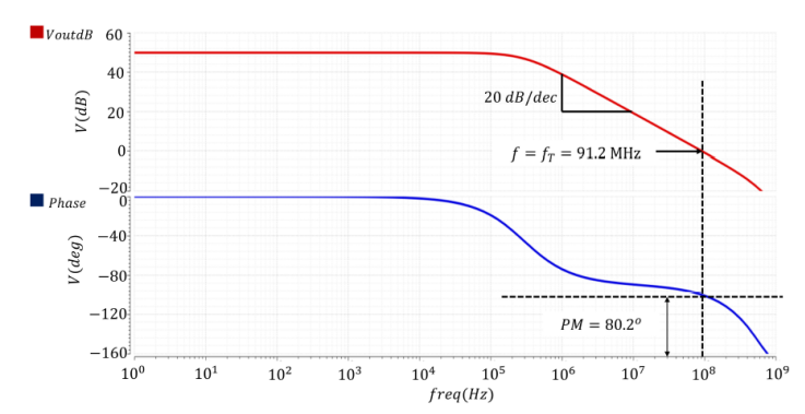 donde g m6 es la transconductancia del transistor M 6. Por otro lado, el producto ganancia-ancho de banda (GBW), el margen de fase (P M), slew rate (SR) y C c , están determinadas por las Ecs. (6), (7), (8) y (9), respectivamente [4,5]: