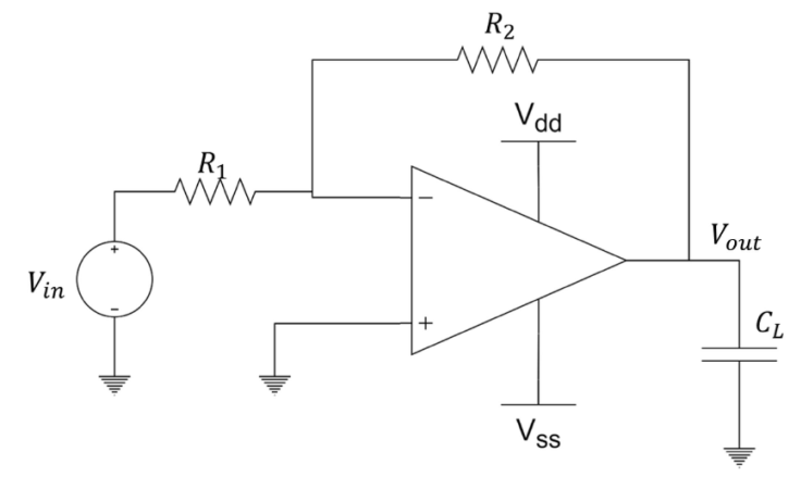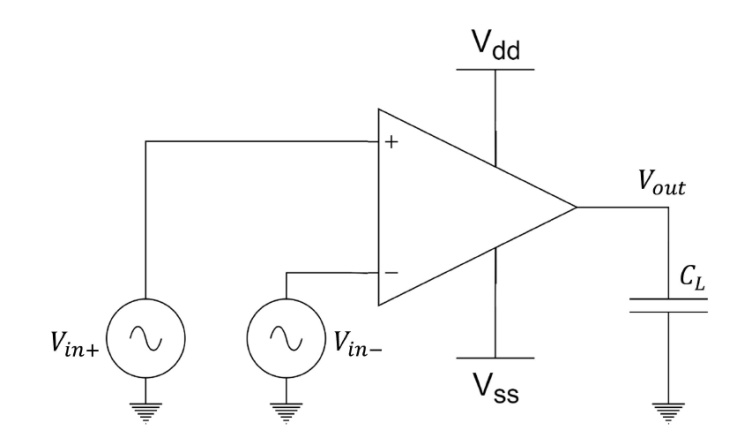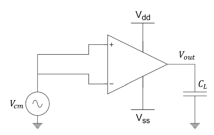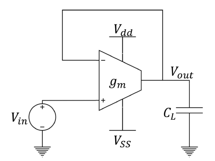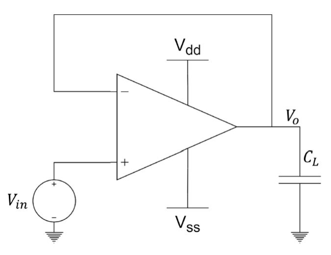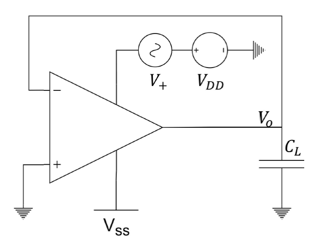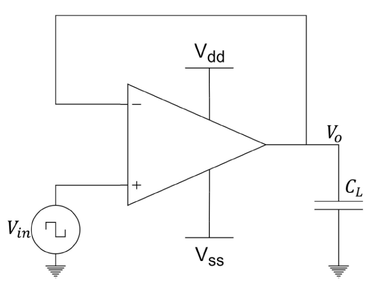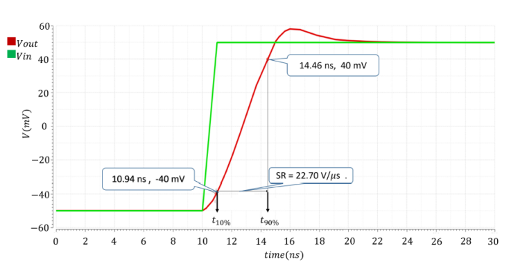 En sentido estricto hasta este punto concluye el análisis en DC, y si bien de simulación se obtienen parámetros básicos de desempeño en lazo abierto, hay otros parámetros de interés que involucra el análisis en lazo cerrado. Uno de ellos es la rapidez de respuesta, o slew rate (SR), que se puede definir como la máxima tasa de cambio en el voltaje de salida cuando el voltaje de entrada cambia de manera abrupta, y está dado en volts por microsegundo. Para cuantificar el SR, se utiliza una configuración de ganancia unitaria como se muestra en la Fig. 8. Se aplica una señal cuadrada V in = 100 mV pp con período de 1 μs y ancho de pulso de 500ñs. Para determinar el SR, se usa la siguiente aproximación: