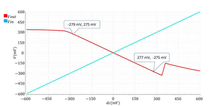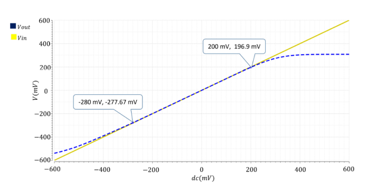 La Fig. 25 muestra la respuesta en frecuencia en lazo abierto (de la ganancia y la fase), donde se observa que A DC,0 = 47:64 dB, P M = 82° y GBW = 332.81 MHz son valores que cumplen con las especificaciones de diseño, y en efecto puede modelarse como un sistema de primer orden. Otro parámetro que se caracteriza mediante simulación es el output swing, el cual define qué tan cercana es la oscilación de la señal de salida a los voltajes de alimentación (V DD y V SS ) [5,4,30]. Este se determina con el circuito mostrado en la Fig. 26, que es una configuración de un amplificador inversor, el cual cuenta con dos resistores R 1 y R 2, un capacitor de carga C L y una fuente de entrada V in, la cual realiza un barrido de -600 mV a 600 mV. La respuesta se muestra en la Fig. 27, donde la curva de transferencia entre V in y V out representa el output swing ubicando los voltajes máximo V omáx = 275 mV y mínimo V omín = -275 mV de salida del amplificador. En la Tabla XII se muestran las dimensiones de los transistores y la multiplicidad de cada uno de éstos, y en la Tabla XIII el rendimiento del amplificador CFF.