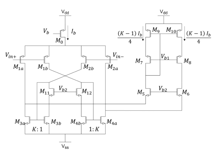 Dos arquitecturas de amplificadores CMOS son el amplificador de dos etapas con compensación Miller y el amplificador folded cascode (FC), mostrados en las Fig. 2 y 3, respectivamente. Su popularidad viene del buen balance entre ganancia, fase y ancho de banda [4,5]. En la práctica existen diversas topologías que se han reportado para diferentes aplicaciones, tanto para el amplificador Miller [11-15], como para el amplificador FC [16-20], donde explican por qué unas son eficientes en uno o varios parámetros de desempeño, pero ni una sola se diseña para ser de propósito general. Aunado a esto, uno de los principales retos para el diseño del OTA u Op-amp es la metodología de diseño, que la mayoría de los casos se realiza con un análisis a “mano” para obtener modelos analíticos que se usan como ecuaciones de diseño, comúnmente basadas en un comportamiento LEVEL = 1 de Spice, el cual puede considerarse un comportamiento ideal [4,21]. Aún más, debido a que se manejan esas ecuaciones de diseño, el método no considera aquellos efectos no-ideales de la tecnología utilizada, llevando a redimensionar el circuito con procedimientos prueba-y-error para alcanzar las especificaciones de diseño. En contraposición, para disminuir estas limitaciones está la metodología gm/ID, que se basa en la curva de eficiencia de esa relación (obtenidas del comportamiento del transistor para cualquier tecnología) y obtener los parámetros de diseño requeridos para una aplicación en particular. En el estado del arte se encuentran dos arquitecturas muy interesantes: el amplificador de dos etapas con compensación feedforward (CFF) [22], y el amplificador recycling folded cascode (RFC) [16]. Estas son variaciones a las arquitecturas Miller y FC, respectivamente. Debido a lo anterior, este trabajo se centra en el análisis, diseño, implementación, simulación y comparación de cuatro amplificadores CMOS con salida simple. Aunque la salida completamente diferencial tiene ventajas como la inmunidad al ruido, amplio output swing y mayor ganancia, hay aplicaciones donde se utiliza la salida simple [23-25,4], por lo tanto en este trabajo se elige el diseño con salida simple para mostrar un análisis práctico y cómo proceder con el diseño. Lo anterior con el interés de diferenciar las ventajas y desventajas de cada amplificador, y que son diseñados con las reglas de diseño de una tecnología CMOS 130 nm. También se muestra una serie de pasos generales para el diseño, utilizando la metodología g m /I D , la cual considera la relación de la transconductancia g m , y la corriente del transistor I D , junto con la corriente de drenaje normalizada I D /(W/L) como parámetros fundamentales para explorar el espacio de diseño.