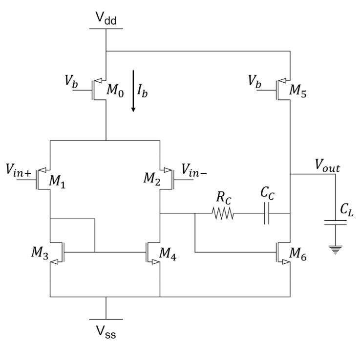 El diseño del amplificador parte del análisis de su arquitectura para definir una estrategia de diseño con base en los parámetros de interés (ganancia, ancho de banda, slew rate, margen de fase, etc). Uno de los análisis más importantes es en pequeña señal, con el cual se definen expresiones en frecuencia que dan una aproximación del comportamiento del sistema y definir los parámetros bajo el control del diseñador. La arquitectura del OTA Miller se muestra en la Fig. 2, donde un par diferencial de entrada PMOS es la primera etapa de amplificación, y la etapa de salida es un amplificador de fuente común. Obsérvese que entre ambas etapas hay una red RC, la cual pudiera no requerirse y ello depende de diversos factores. Por ejemplo, si el amplificador Miller maneja una carga capacitiva C L , es posible que el margen de fase -del amplificador en lazo abierto- no garantice la estabilidad cuando se requiera incluir un lazo de retroalimentación. Entonces, para garantizar la estabilidad, el capacitor de compensación C c ayuda a corregir el margen de fase usando el efecto Miller [4], y cuyo valor depende del valor de la carga C L y del dimensionamiento del amplificador. Nótese que al ser un amplificador de dos etapas, su función de transferencia puede modelarse como un sistema de segundo orden. Ahora bien, el capacitor C c afecta la posición del polo dominante y lo mueve a bajas frecuencias (ese efecto se denomina pole-splitting), mientras que el polo no dominante lo mueve a frecuencias altas. Sin embargo, debido a la inclusión de C c , el cual forma una conexión feedforward, pudiera dar lugar a un cero que afectará el margen de fase y en consecuencia a la estabilidad; en un diagrama de Bode el cero se aprecia entre los polos del sistema. Cuando es el caso el cero puede ser removido al usar un resistor R c de cancelación (del cero) en serie con C c . Pero, muy importante, pole-splitting sí da lugar a un cero, pero no necesariamente aparece entre los polos. No obstante, hay quienes recomiendan el uso de R c para eliminar al cero [5].