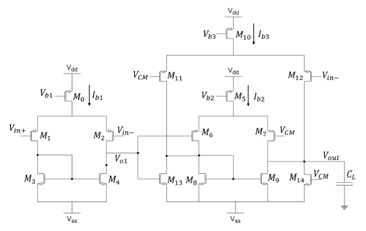En los amplificadores CMOS es complicado obtener un diseño de alta ganancia y un amplio ancho de banda porque éstos y otros parámetros (potencia, impedancia de salida, ruido, etc) se relacionan entre sí, haciendo del diseño un problema de optimización multidimensional [4]. Entonces, se pueden identificar amplificadores multi-etapa que son diseñados para tener una ganancia grande usando transistores polarizados con un bajo nivel de corriente. Y también están los amplificadores con un amplio ancho de banda que usan etapas simples con transistores polarizados con un alto nivel de corriente. Para aprovechar las ventajas de cada una de estas arquitecturas, existen amplificadores como el amplificador de dos etapas con compensación Miller (ver Fig. 2) visto en la Sec. 2. Como sabemos, en un amplificador Miller, el polo dominante es desplazado hacia frecuencias bajas debido al efecto del pole-splitting, resultando en estructuras de alta ganancia, adecuada compensación de fase, pero de menor ancho de banda. Entonces, para evitar este inconveniente en la Ref. [22] se propone y se explica un esquema de compensación feedforward (CFF) para amplificadores multi-etapa sin usar capacitores de compensación. La arquitectura propuesta es un amplificador de dos etapas con CFF [22,33] que se muestra en la Fig. 22. Se observa que tanto la primer (M 0-M 4) como la segunda etapa (M 5-M 9) son un par diferencial de salida simple, y la etapa feedforward está implementada por los transistores M 10 - M 14. Este esquema usa un corrimiento de fase positivo de los ceros ubicados en el semiplano derecho, generados mediante una ruta feedforward para compensar el corrimiento de fase negativa de los polos. El par polo-cero es situado en frecuencias grandes para evitar componentes de establecimiento lentos asociados con la cancelación polo-cero a bajas frecuencias, lo cual ocasiona que el polo dominante (ubicado en frecuencias menores al segundo polo) sea cancelado junto con el cero [22,34]. Otra ventaja de este amplificador es que evita al capacitor de compensación, y así reducir espacio de integración y obtener mejoras en la corrección del P M, A DC,0 y GBW [22].