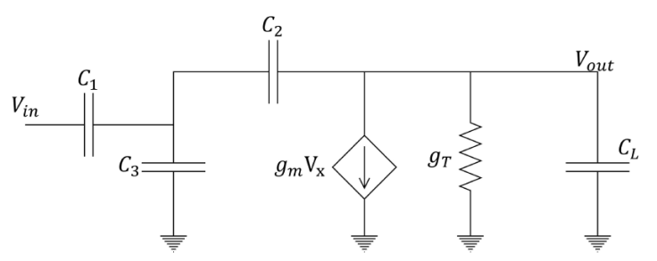 Este análisis se realiza con ayuda del circuito equivalente mostrado en la Fig. 4. La función de transferencia H M (s) y la ganancia en baja frecuencia A DC,0 están dadas por (1) y (2), respectivamente [4,5]: