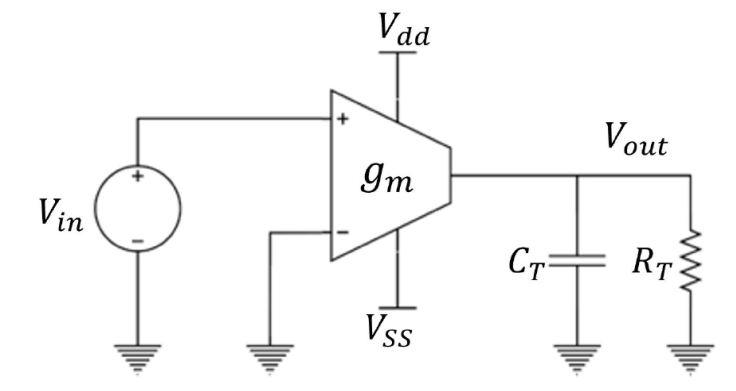 donde μ es la movilidad de los portadores de carga, C ox es la capacitancia de óxido, W y L son el ancho y largo del canal del transistor, V GS es el voltaje de compuerta-fuente y V T H es el voltaje de umbral. En Refs. [4,26,27] se determina que la ley cuadrática falla completamente en la región de débil inversión, y en fuerte inversión no es precisa debido a los efectos de canal corto [4,5,29]. Para la operación en inversión moderada no existe un modelo simple que pueda usarse o que describa un comportamiento aproximado. Por lo anterior, una alternativa de modelo simple que proporciona una intuición en el diseño analógico es la ley cuadrática, que puede usarse para entender las tendencias del comportamiento de un circuito, pero no para calcular el dimensionamiento de los transistores. Por esta razón una buena práctica en el diseño analógico, aplicada en este trabajo, es usar el análisis de transistores en saturación, usando su modelo en pequeña señal (como el mostrado en la Fig. 4) para llegar a expresiones que ayuden a comprender el comportamiento aproximado del circuito, y así identificar parámetros que puedan ser de ayuda para alcanzar las especificaciones de diseño como las mostradas en Ecs. (6)-(9).