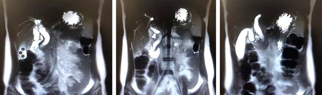 Dos días después, el paciente mostró aumento de su tinte íctérico en mucosas y piel y persistencia de dolor en hipocondrio derecho. Una nueva CRM reveló distención vesicular importante (diámetro longitudinal de 88 mm) con presencia de dos cálculos de 8 mm, el colédoco con aumento de su diámetro proximal (calibre máximo 13 mm), y disminución de su lumen distal (porción intramural), con una imagen hipointensa (5 mm) que podría corresponder a cálculo neumobilia, además de dilatación de la vía intrahepática (Figura 1).