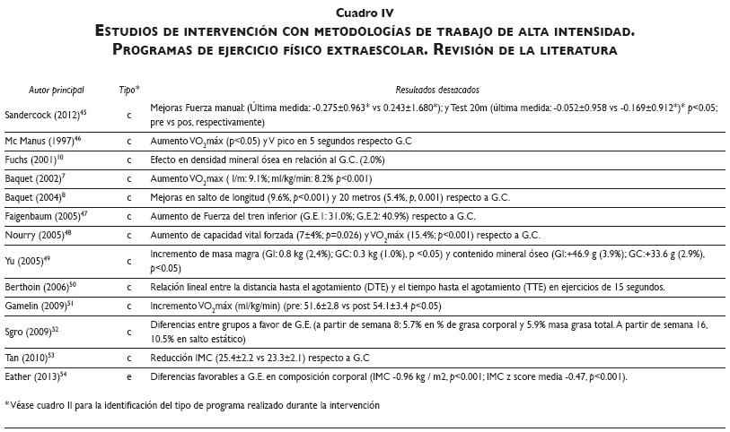 Los resultados relativos a los artículos de intervención coindicen con los anteriores en la relación positiva entre AF y CF/salud (cuadros III y IV).*,24 Los estudios que analizan otras variables, como programas de educación saludable o control de ingesta calórica, también logran efectos positivos (98% del total) a excepción de la investigación dirigida por Robbins55 y colaboradores, cuyo programa de educación saludable no mostró resultados significativos a pesar de que el grupo intervención experimentó mejoras.