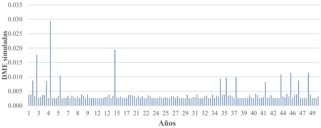 Un total de 10,000 escenarios demandas fueron simulados para cada edificio analizado considerando una vida útil de 50 años. Las demandas sísmicas a las que se sometieron los edificios fueron simuladas utilizando las CPDE de cada edificio. Para la simulación de demandas se consideró que se presentan una media de 3 sismos por año con magnitud mayor o igual a 6. En la Figura 10 se muestra un escenario de las DME simuladas durante la vida útil del edificio de 10 niveles diseñado con la combinación 12 ubicado en suelo Ts=1.5s.