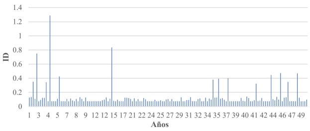 Los daños en los edificios durante su vida útil fueron obtenidos mediante el índice de daño (ID) de la ecuación 3, aplicado a cada demanda generada en los escenarios de las simulaciones. La Figura 11 muestra los ID para un escenario de simulación durante la vida útil del edificio de 10 niveles diseñado con la combinación 12, ubicado en suelo TS=1.5s, que presenta un estado límite de servicio igual a δy=0.0010, y un estado límite de colapso igual a δu=0.0231.