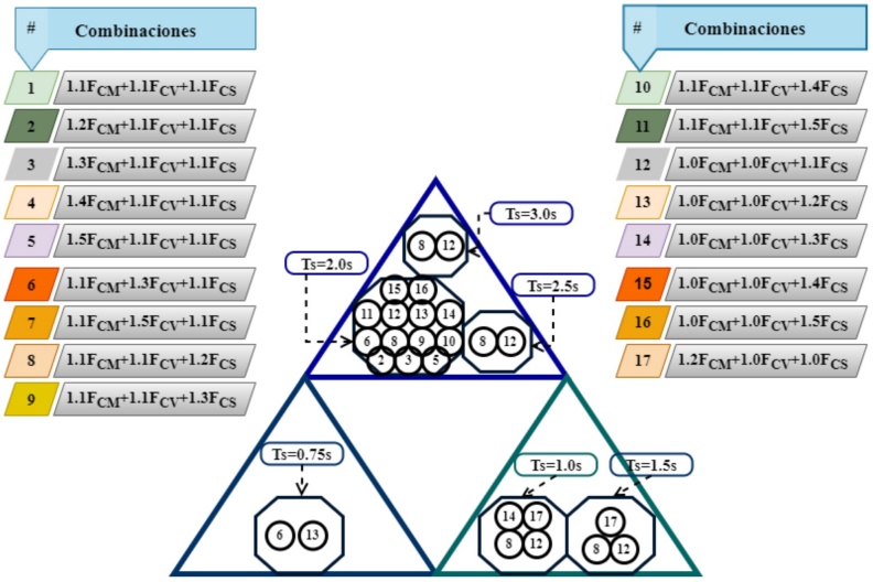 Los resultados mostraron que las combinaciones con menor costo total promedio para el conjunto de edificios diseñados en el suelo con periodo TS=0.75s fueron las combinaciones; 2, 3, 5 y 13. Las combinaciones que presentaron menor costo para el caso del suelo con periodo TS=1.0s, fueron las combinaciones; 8 y 12. En el caso del suelo con periodo TS=1.5s las combinaciones que presentaron menor costo para el conjunto de edificios diseñados, fueron las combinaciones; 3, 8, 12, 14 y 17. Las combinaciones con menor costo promedio para suelo con periodo TS=2.0s fueron las combinaciones; 2, 5, 6, 8, 9, 10, 11, 12, 13 y 14. En el suelo con periodo TS=2.5s, las combinaciones con menor costo promedio fueron; 1 y 12, finalmente para el suelo con periodo TS=3.0s las combinaciones con menor costo fueron; 2, 3, 6, 7, 8, y 12.