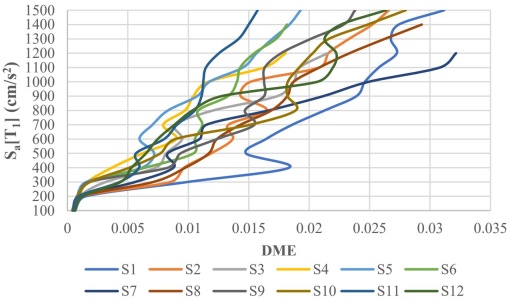 La Figura 6 muestra una gráfica con las curvas ADI obtenidas de los análisis del edificio de 10 niveles diseñado con la combinación 12, ubicado en suelo TS=1.5s sujeto a las demandas sísmicas de 12 registros diferentes. De la figura podemos observar que las curvas tienden a comportarse de manera lineal hasta cierto incremento de aceleración, aproximadamente 200 gales, en todos los registros sísmicos. Esto representa el comportamiento elástico lineal del edificio ante esas demandas. Cuando se cruza esta linealidad en la curva, decimos que el edificio empieza su comportamiento no lineal y se produce un comportamiento ondulante en las gráficas. La incertidumbre que se presenta en los análisis se puede visualizar en los diferentes comportamientos que se presentan en las curvas al incrementar la aceleración después del límite elástico. En la Figura 6 se puede observar que para la curva del sismo 1 (S1), se presentan una distorsión de d=0.018 cuando la aceleración alcanza los 400 cm/s2, por otro lado, para la curva del sismo 4 (S4), con la misma aceleración solo se alcanza una distorsión de d=0.003.