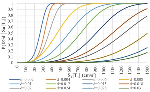 El conjunto de curvas de peligro de demanda estructural (CPDE) necesarias para entrenar las RNA fueron obtenidas mediante la ecuación 1. Para resolver esta ecuación, primero fue necesario obtener las curvas de fragilidad de los edificios mediante la aplicación de la ecuación 2. Las curvas de fragilidad obtenidas para el edificio de 10 niveles diseñado con la combinación 12, ubicado en suelo TS=1.5s se pueden observar en la Figura 7. Estas curvas representan la probabilidad condicional acumulada de que se alcance o exceda cierta distorsión (d) dado un nivel de intensidad sísmica (Sa). En la Figura 7 se observa que este edificio de 10 niveles tiene una probabilidad del 50% de alcanzar o exceder la distorsión d=0.015 con una aceleración igual a Sa=900 cm/s2.