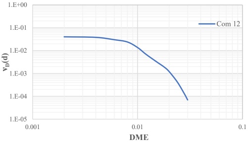 La CPDE para el edificio de 10 niveles que se muestra en la Figura 8 se obtuvo aplicando la ecuación 1. Esta curva representa las tasas medias anuales de excedencia de un rango de distorsiones máximas de entrepiso (DME). En la figura podemos observar que para una distorsión máxima de entrepiso DME=0.015, se tiene una tasa de excedencia νD(0.015)=0.003378, correspondiente a un periodo de retorno igual a 296 años.