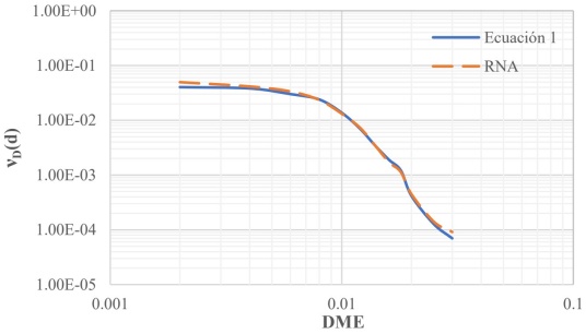 La comparación de los resultados obtenidos con la RNA se puede observar en la Figura 9, donde se muestra la comparación entre dos CPDE del edificio de 10 niveles diseñado con la combinación 12, ubicado en suelo con periodo Ts=1.5s. La primera de las curvas fue obtenida utilizando la ecuación 1 (línea continua) y la segunda curva fue obtenida con la RNA (línea discontinua). Se puede observar cómo la CPDE obtenida con la RNA presentó una buena precisión al compararla con la curva obtenida con la ecuación 1, en la cual se obtuvo un error medio cuadrático (ECM) igual a 9.23e-6 y un error relativo aproximado del 1.5%.