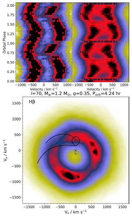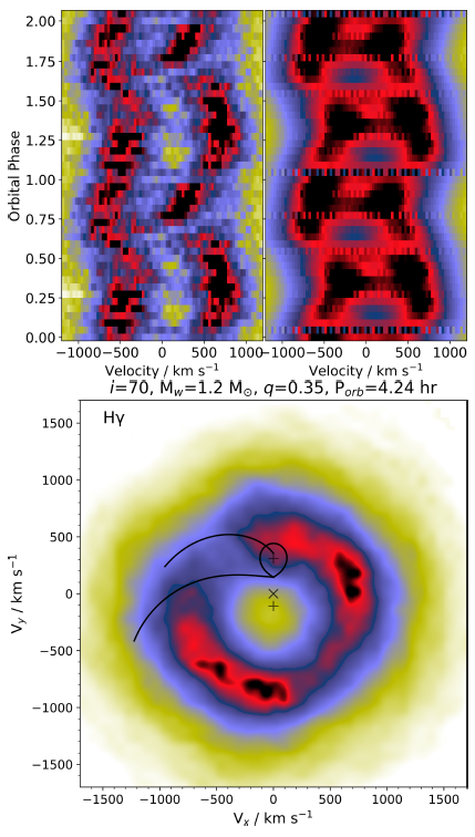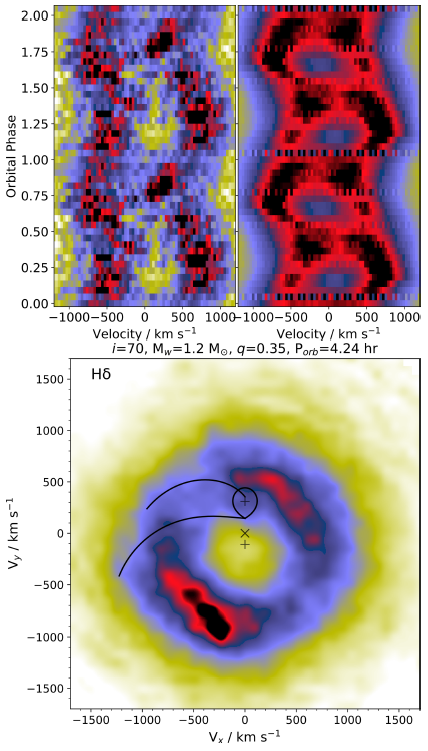 Doppler tomography is an indirect imaging technique developed by Marsh & Horne (1988). It produces two-dimensional mappings of the emission intensity in velocity space of the accretion disc, using the phase-resolved profiles of the spectral emission lines. We produced the Doppler tomography of the Hβ, Hγ and Hδ Balmer emission lines, using a Python wrapper 3 (Hernandez Santisteban 2021) of the fortran routines published by Spruit (1998) within an IDL environment. Figures 8-10, show the resulting images from the analysis, with the following layout: in the top left panel we show the observed trailed spectra; the tomography is displayed in the bottom panel; and the reconstructed trailed spectra, which are created by collapsing the tomography image along the direction defined by the respective orbital phase (Marsh 2005), appear in the top right panel.