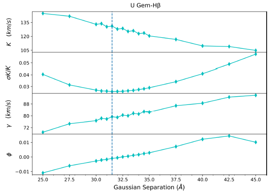 Following the methodology described by Shafter et al. (1986), we made a diagnostic diagram to find the optimal Gaussian separation, by fitting each trial to a simple circular orbit :