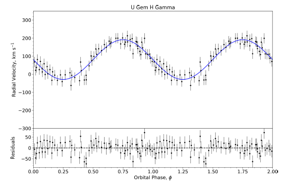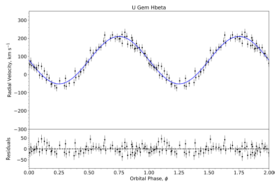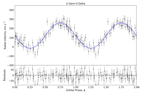 Multiple radial velocity studies have been conducted on U Gem, from which the semi-amplitudes of the components have been derived. Tracing the Hα Balmer emission line, Echevarría et al. (2007) obtained a radial velocity for the white dwarf of K 1 = 107 ± 2 kms−1, in agreement with the analyses of FUV observations put forward by Long & Gilliland (1999), who reported a value of K 1 = 107.1 ± 2.1 kms−1.