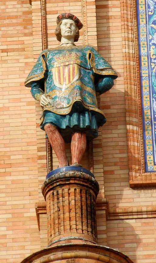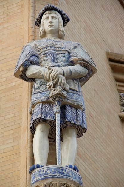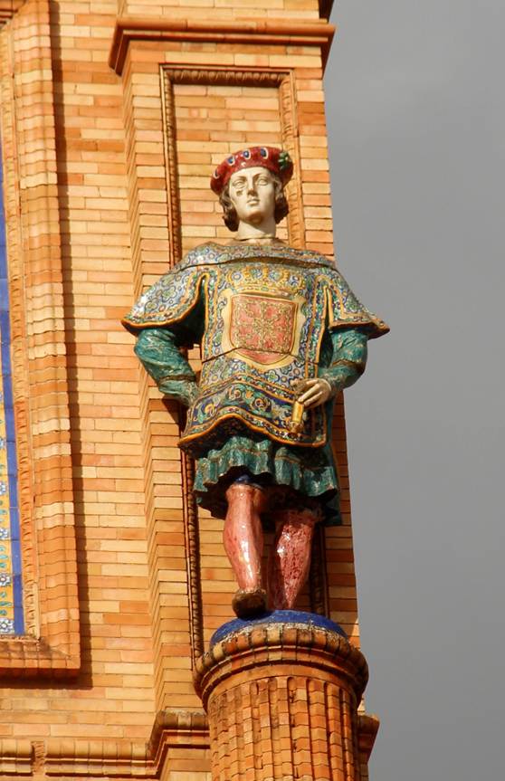 Vimos que esos dos escultores, Antonio Bidón y Pedro Navia, los dos expertos en escultura vidriada y activos en la Exposición Iberoamericana de Sevilla de 1929, pudieran estar relacionados con estos conjuntos de esculturas; sin embargo, estos últimos están concebidos con un mismo procedimiento, mediante la unión de tres partes bien diferenciadas y con la central cerrada con un plano recto horizontal en la parte inferior, en el que ensamblan las piernas. Es un dato técnico muy significativo, que no se ha tenido en cuenta y que no puede pasarse por alto, ya que indica la posible ejecución de los dos conjuntos en un mismo taller, al que llegarían en el caso de los Maceros del Pabellón Real, mediante el contrato firmado por José Granados de la Vega con Pelayo Romero Bazán el día 15 de febrero de 1929, bien documentado. En este caso, habría que tener en cuenta el posible desfase respecto de la edificación del propio pabellón. La ejecución del conjunto de cerámica de la Plaza de España en dos fábricas distintas, Mensaque Rodríguez y Manuel García Montalván, acota las opciones, mucho más claras cuando tenemos en cuenta que a la primera le correspondió la factura de los tondos modelados por Pedro Navia para las enjutas de los arcos de la arcada del primer cuerpo, documentados con la carta dirigida por José Granados de la Vega a Pedro Navia en febrero de ese año.