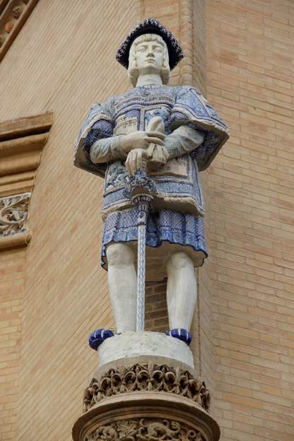 Son seis esculturas de tamaño mayor del natural: los dos Maceros reales, situados a la altura del dintel de la portada principal del Pabellón Real, y los cuatro Heraldos, que flanquean las ventanas del pabellón central del edificio de la Plaza de España. Todas están modeladas con cuidada factura y acabados vidriados singulares. Cumplen una función específica en la estructura arquitectónica; en el primer caso, anuncian la presencia real y tal naturaleza en dicho pabellón; en el segundo, ennoblecen la fachada principal del edificio, dedicado a las regiones de España en la citada exposición. Sorprende, pues, la falta de datos y la escasa difusión y reconocimiento que han tenido hasta hoy día, y más al tener en cuenta los apreciables valores plásticos y la singularidad material que las caracterizan, y haber sido resueltas mediante un procedimiento con tan alta aceptación en la ciudad desde que Francisco Niculoso Pisano introdujese los modelos italianos a finales del siglo xv y principios del XVI, y, por supuesto, en época contemporánea desde los trabajos de Antonio Peña y Antonio Susillo en el último cuarto del siglo XIX.