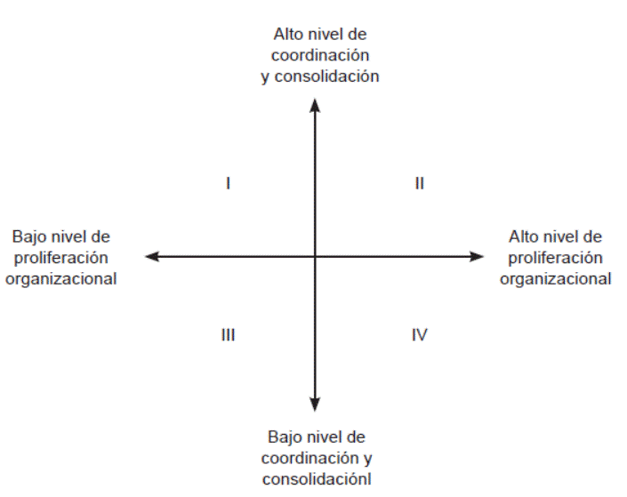 En el cuadrante I de esta gráfica existe una administración tradicional burocrática que está a cargo de una política institucionalizada; la coordinación se lleva a cabo mediante el uso de mecanismos de jerarquía (por ejemplo, el control directo de los ministerios). En el siguiente cuadrante (II) existe un alto nivel de coordinación, no obstante la existencia de muchas organizaciones en donde se pueden desarrollar ambientes de alto profesionalismo, comunicación fluida y alta confianza. En el cuadrante III existe un bajo nivel de coordinación, pero también pocas organizaciones, lo que involucra organizaciones usualmente confrontadas o competitivas. Finalmente, en el cuadrante IV existen muchas organizaciones y una baja coordinación entre ellas, lo cual genera una fuerte fragmentación e incoherencia (véase Méndez, 2020).