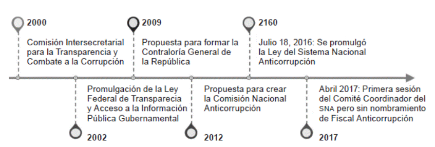 6Particularmente se establecieron dos compromisos: “Compromiso 85: Se creará un sistema nacional contra la corrupción que, mediante una reforma constitucional, establezca una Comisión Nacional y comisiones estatales con facultades de prevención, investigación, sanción administrativa y denuncia ante las autoridades competentes por actos de corrupción”; “Compromiso 86: Se creará un Consejo Nacional para la Ética Pública con la participación de diversas autoridades del Estado mexicano y miembros de la sociedad civil para dar seguimiento a las acciones concertadas contra la corrupción.”