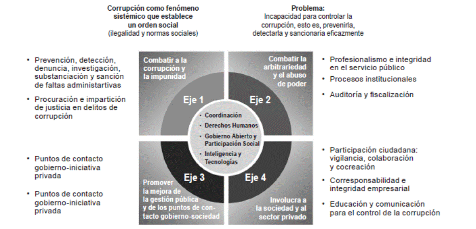 El SNA busca prevenir, detectar y sancionar actos de corrupción, la cual es entendida como un problema multicausal y multifacético que forma parte de un sistema de problemas y por tanto es estructural. Ante esta situación, se ha planteado el concepto de coordinación como una herramienta que puede integrar a diferentes instituciones de gobierno para el combate efectivo a la corrupción, a través de la PNA. No obstante, esta propuesta tendrá impacto en la medida en que se establezcan y ejecuten mecanismos de coordinación claros, lo cual es un reto para un sistema que se rige por esquemas de coordinación horizontales en la toma de decisiones, pero que durante la implementación de cualquier acción tendría que recurrir al principio de jerarquía para asegurar un cumplimiento efectivo de los programas de combate a la corrupción.