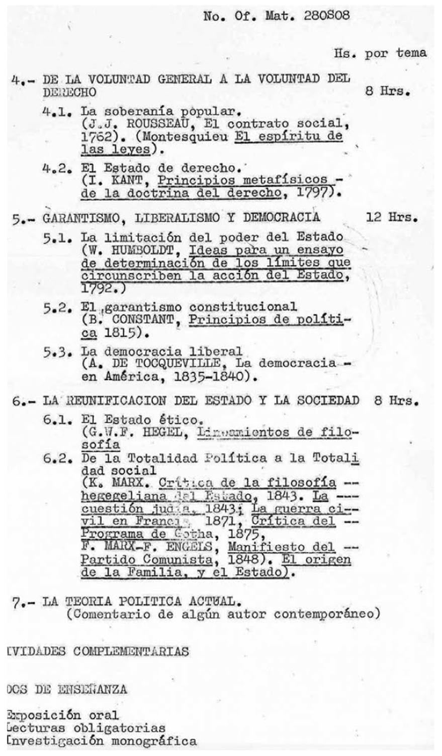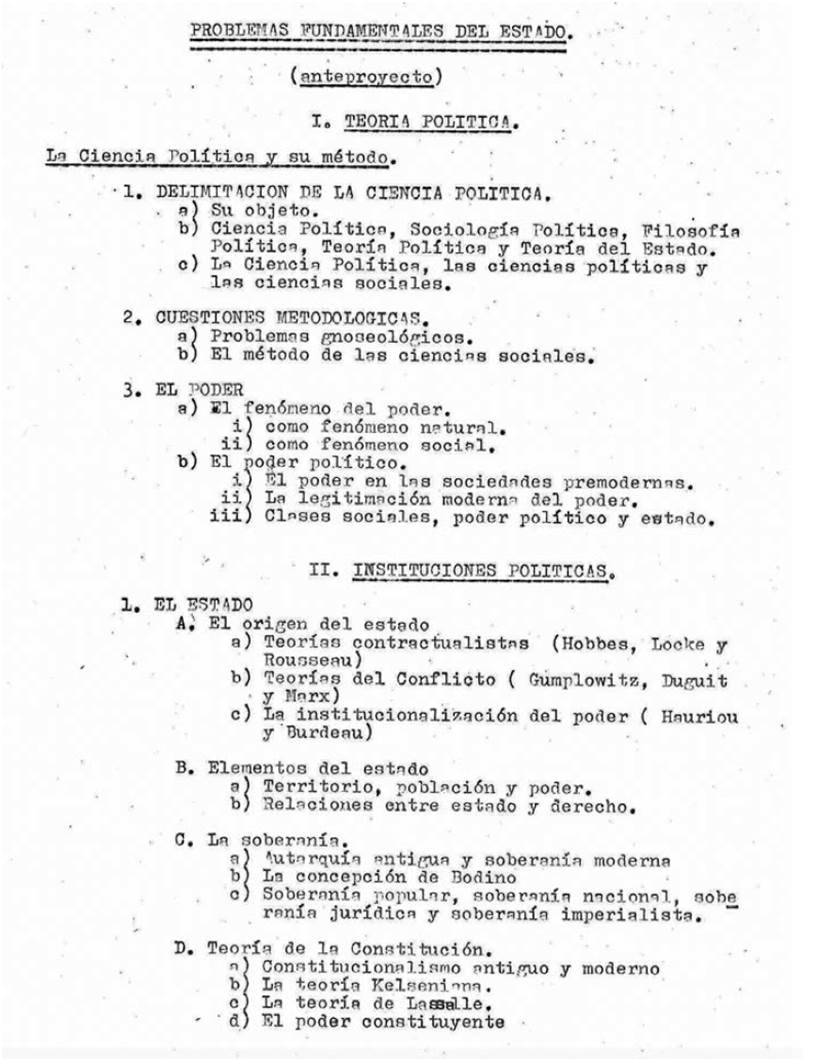 Después de una búsqueda minuciosa en mis archivos, encontré algunos documentos que considero pertinentes para la reflexión que realice en el presente texto. Los años de impartir cátedra en la UNAM -tanto en la Facultad de Derecho, donde me inicié, como en la Facultad de Ciencias Políticas y Sociales, en donde actualmente estoy adscrito- me han permitido hacer acopio de programas, temarios, cuestionarios y bibliografía relativos a la Teoría General del Estado, que me parecieron dignos de tener como referencia para mis propios cursos. Para quien desee consultarlos, puede revisar el anexo de este escrito y corroborará su valor que el tiempo no ha erosionado. Los documentos reunidos fueron escritos por Don Manuel Pedroso, Dr. Mario de la Cueva, Dr. Héctor González Uribe y Mtro. Jesús Reyes Heroles. También se encuentran los correspondientes a la autoría del Dr. Arnaldo Córdova, quien como yo tuvo trato intelectual con respecto a él y a su obra, y de lo cual no se tendrá duda, aunque no tengan su nombre. Haciendo una somera revisión de esos documentos, se pueden constatar varias coincidencias o constantes, más allá de las explicables diferencias debidas a las diversas formaciones o trayectorias intelectuales de los autores.
