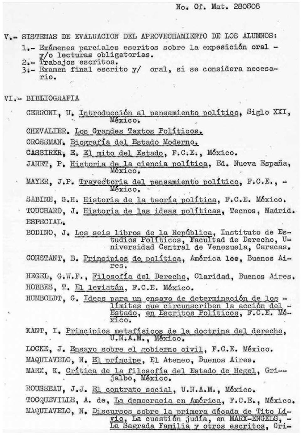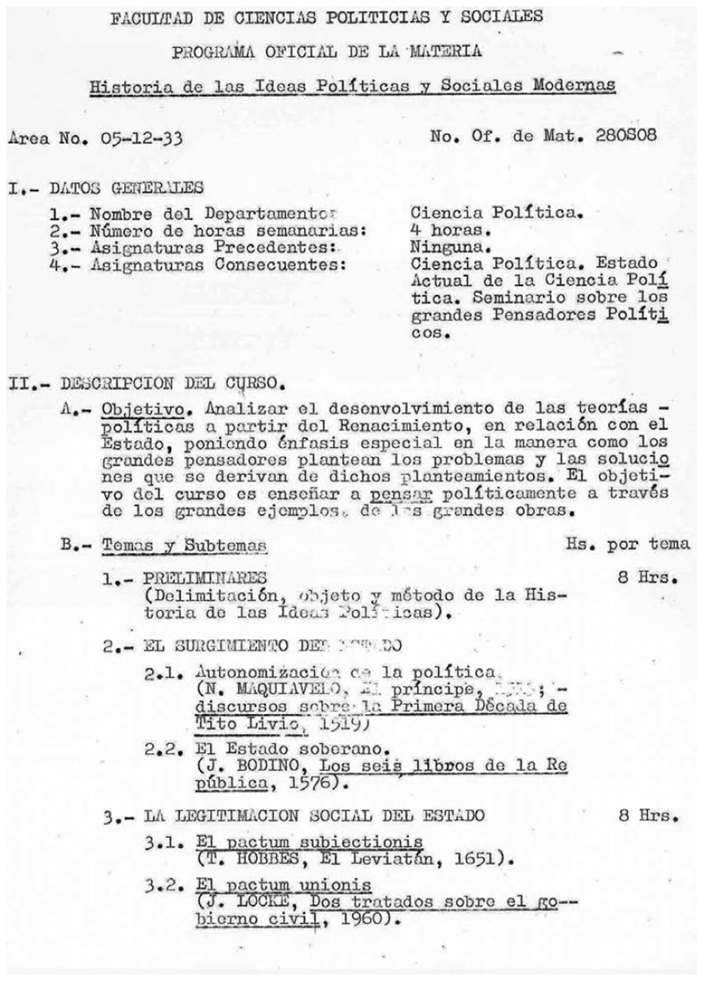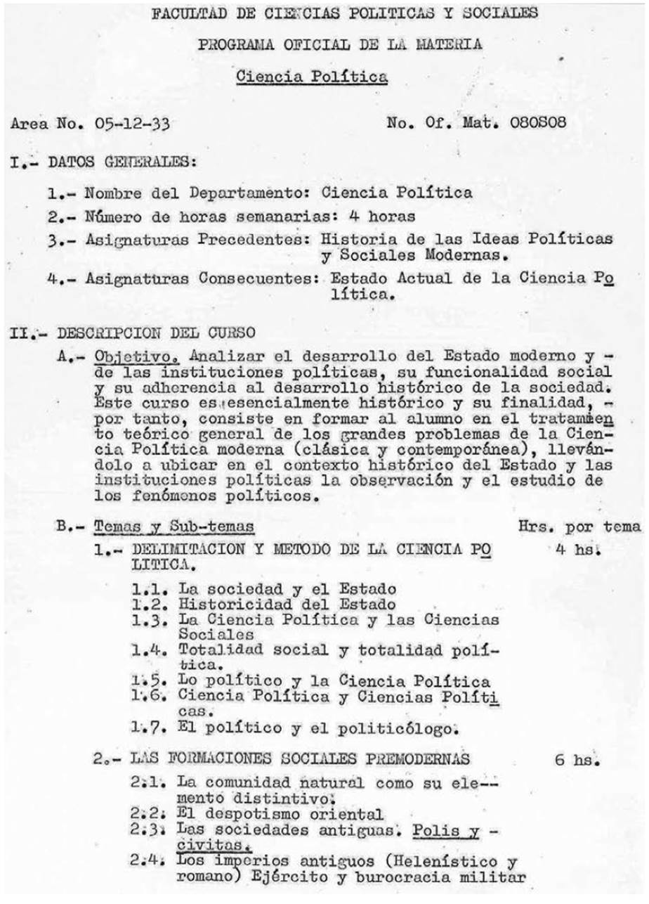 El programa oficial de entonces de Ciencia Política es el segundo docu mento de la autoría del Dr. Córdova. El objetivo del curso no deja lugar a dudas, pues señala que será el de analizar el desarrollo del Estado moderno y de las instituciones políticas, su funcionalidad social y su adherencia al desarrollo histórico de la sociedad. Este curso es esencialmente histórico y su finalidad, por tanto, consiste en formar al alumno en el tratamiento teórico general de los grandes problemas de la Ciencia Política moderna (clásica y contemporánea), llevándolo a ubicar en el contexto histórico del Estado y las instituciones políticas la observación y el estudio de los fenómenos políticos