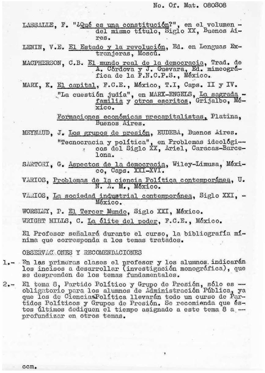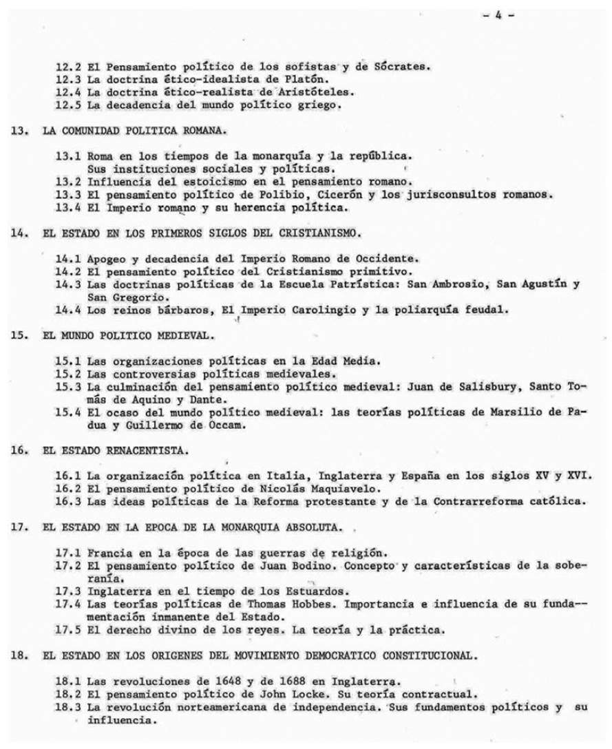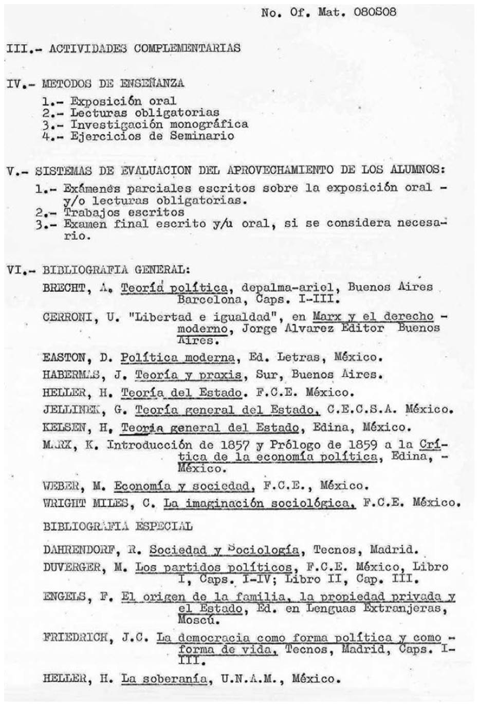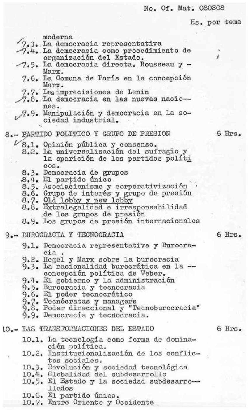 El programa oficial de entonces de Ciencia Política es el segundo docu mento de la autoría del Dr. Córdova. El objetivo del curso no deja lugar a dudas, pues señala que será el de analizar el desarrollo del Estado moderno y de las instituciones políticas, su funcionalidad social y su adherencia al desarrollo histórico de la sociedad. Este curso es esencialmente histórico y su finalidad, por tanto, consiste en formar al alumno en el tratamiento teórico general de los grandes problemas de la Ciencia Política moderna (clásica y contemporánea), llevándolo a ubicar en el contexto histórico del Estado y las instituciones políticas la observación y el estudio de los fenómenos políticos