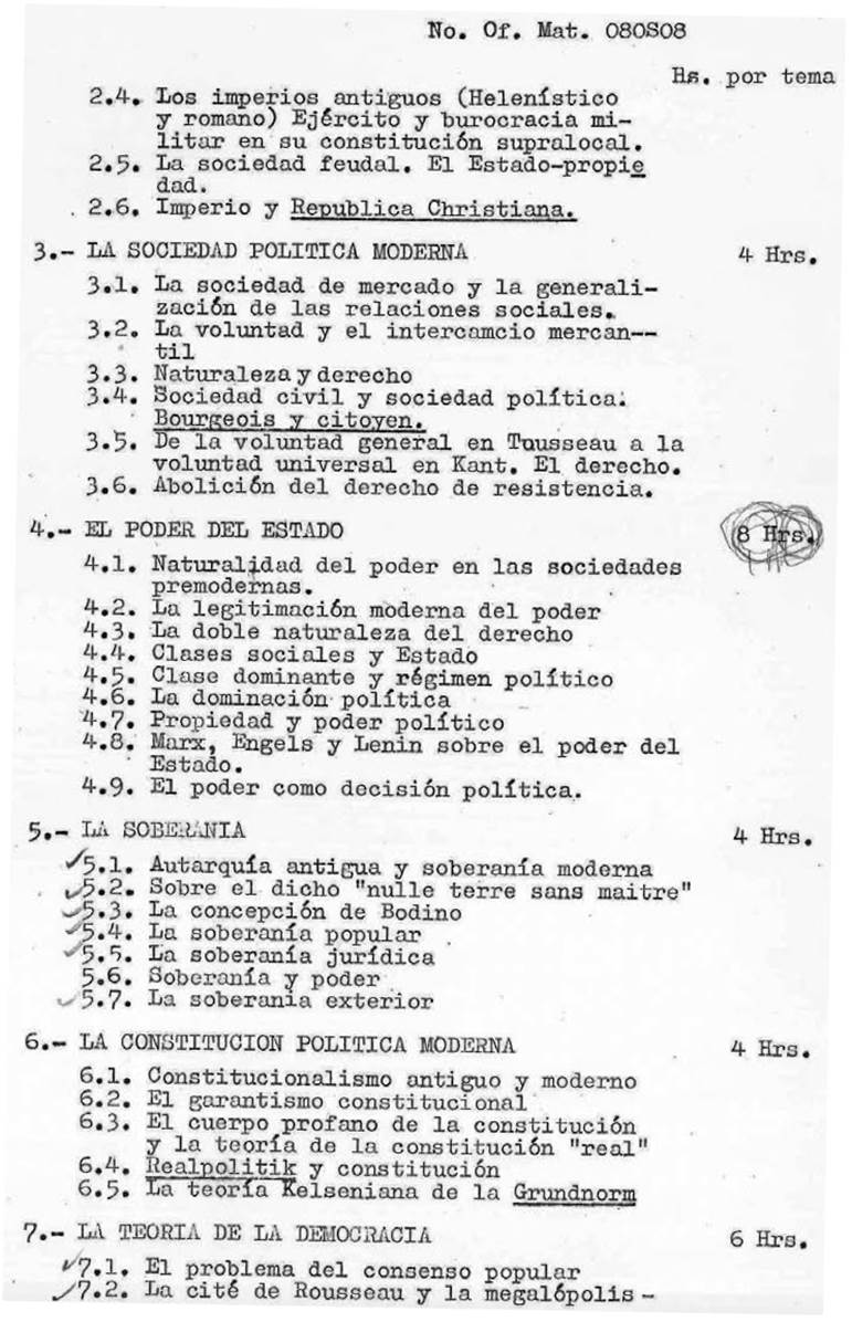Del Dr. Arnaldo Córdova pude encontrar tres documentos que a mí me parecen enlazados alrededor del tema del Estado y donde éste tiene una centralidad notable. El primero de estos programas está dedicado a los problemas fundamentales del Estado, lo cual ya indica la importancia concedida al tema. Uno de sus apartados iniciales se refiere a la delimitación de la Ciencia Política y aunque al enumerar diversas disciplinas, se diferencie Ciencia Política, Sociología Política, Filosofía Política, Teoría Política y Teoría del Estado, da la impresión de que está tratándose de un mismo objeto de estudio analizado desde las diversas ópticas que esas disciplinas ofrecen. La segunda parte del programa se refiere a las instituciones políticas y ahí aparece el Estado como la institución política central. Los apartados que la integran, en efecto, dan cuenta de ello y de su referencia a la Teoría General del Estado: el origen del Estado; los elementos de éste; la soberanía y la teoría de la Constitución.