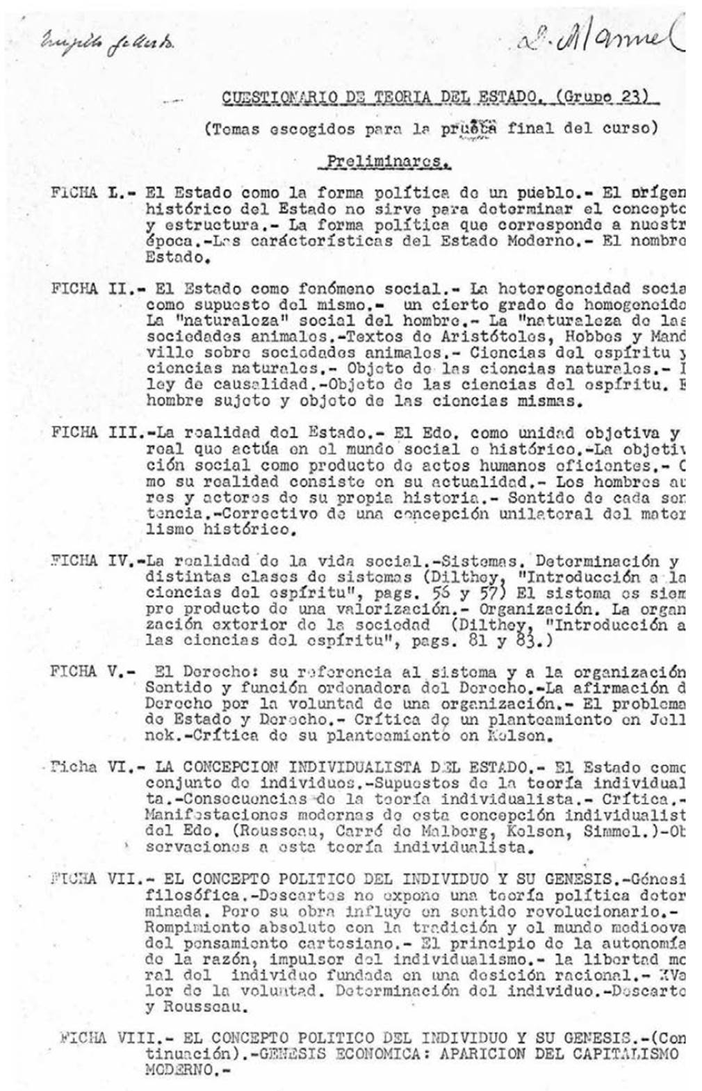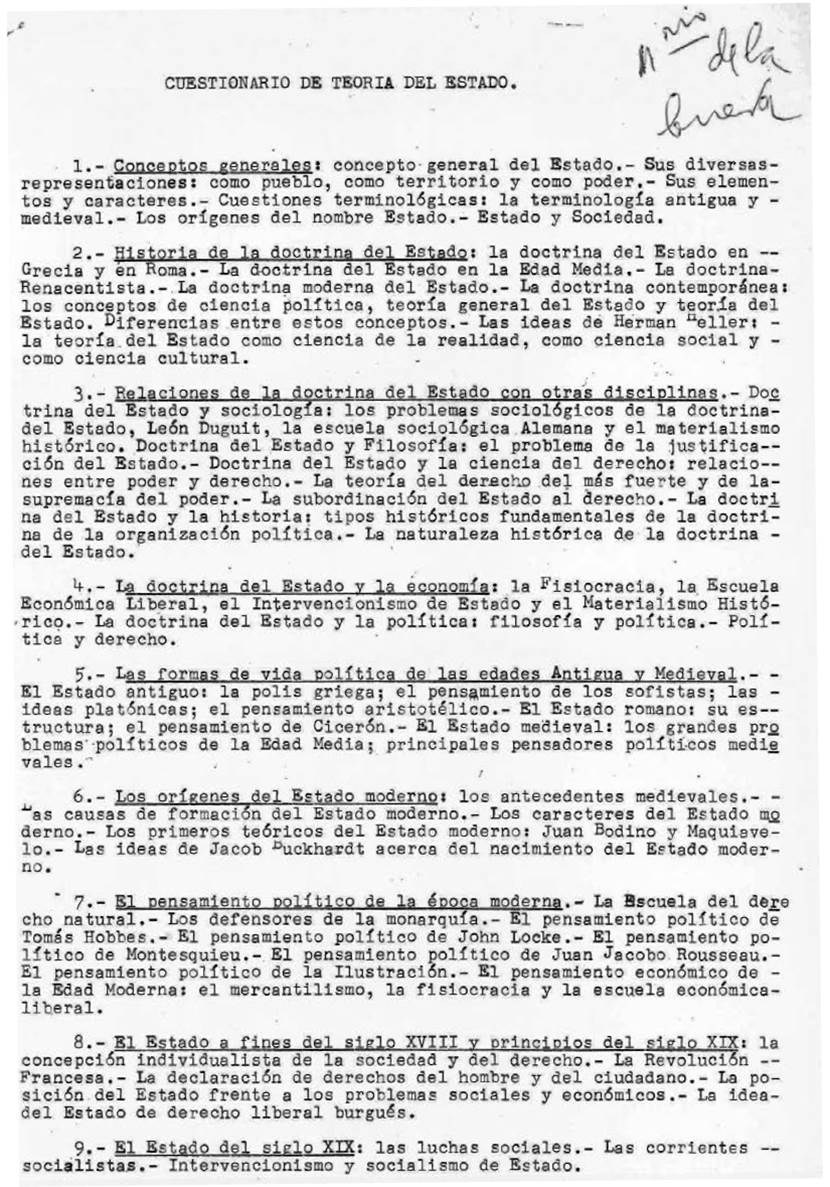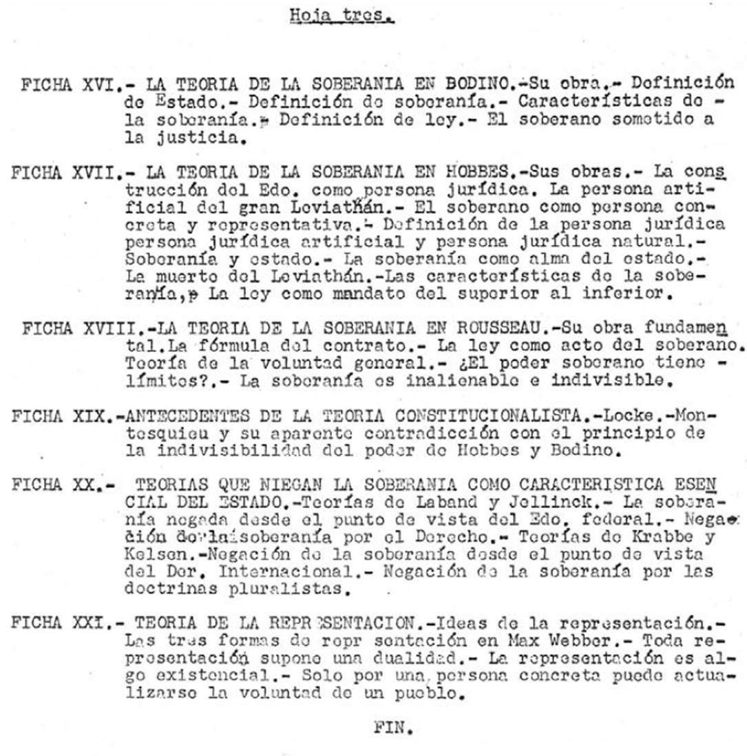 El documento que pude obtener del Dr. Mario de la Cueva, denominado Cuestionario de Teoría General del Estado, consta de treinta y tres fichas o apartados dedicados a una especie de vasta historia de las ideas políticas, vinculadas con el Estado: su nacimiento; su desarrollo; sus relaciones, por ejemplo, el vínculo entre Estado y Derecho; la naturaleza del Estado; los elementos del Estado: el territorio, la población, el poder; el tema de la soberanía y un amplio desarrollo histórico de las luchas entre el Papado, el Imperio y el rey de Francia; la doctrina de la soberanía y se pasa revista a Bodino, Hobbes, Rousseau, Jellinek; están presentes también la doctrina sobre la personalidad jurídica del Estado, las formas del Estado, la justificación del Estado y todo ello con amplia referencia a numerosos autores.