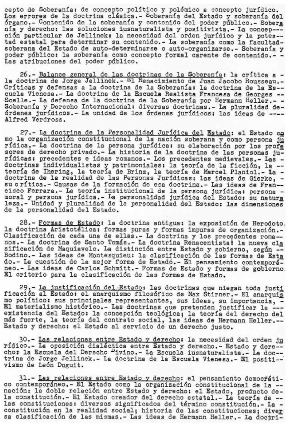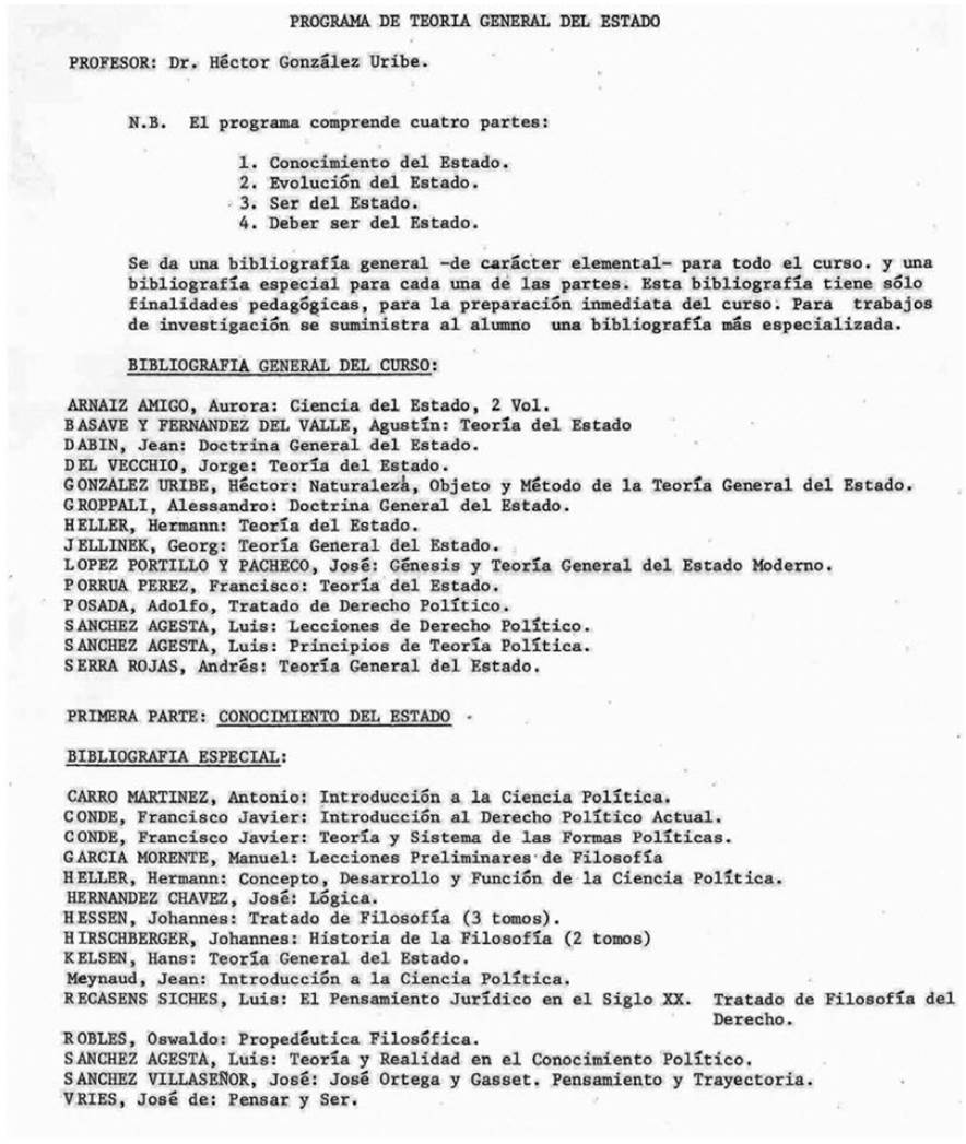 Pude encontrar el programa de Teoría del Estado del Dr. Héctor González Uribe, profesor de esa asignatura en la Facultad Derecho de la UNAM y reputado profesor también de la Facultad de Filosofía de la Universidad Iberoamericana. Habiendo estudiado la licenciatura en Derecho en la Escuela Nacional de Jurisprudencia, González Uribe trabajó como abogado en despachos particulares y en la Suprema Corte de Justicia como secretario de estudio y cuenta. Más tarde ingresó a la Compañía de Jesús, recibiendo las órdenes sacerdotales y continuó estudios de Filosofía y Teología en Austria y Alemania. Obtuvo el grado de Doctor en la Universidad de Innsbruck con una tesis titulada Estado y persona. Fundamentos de una Metafísica del Estado.