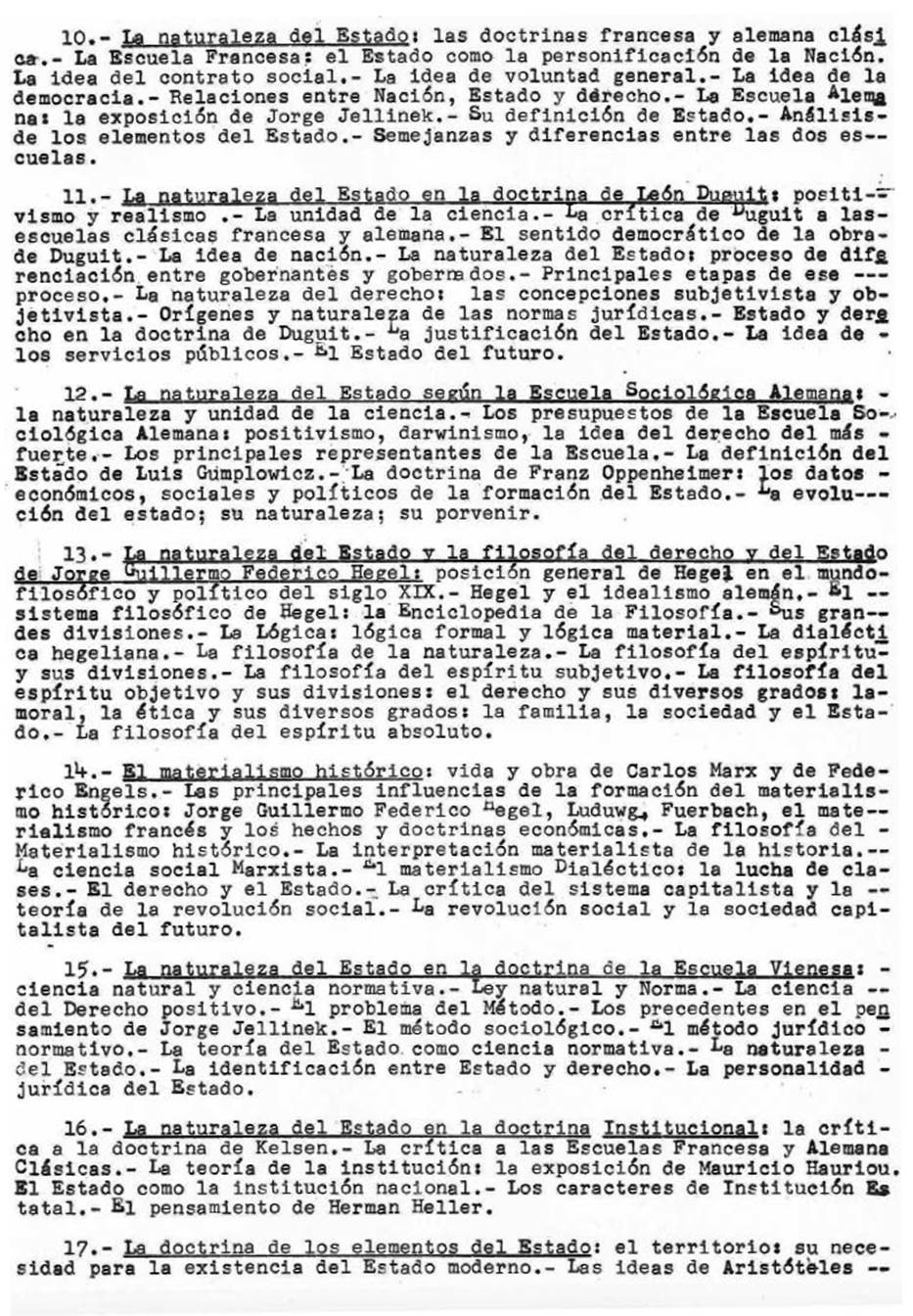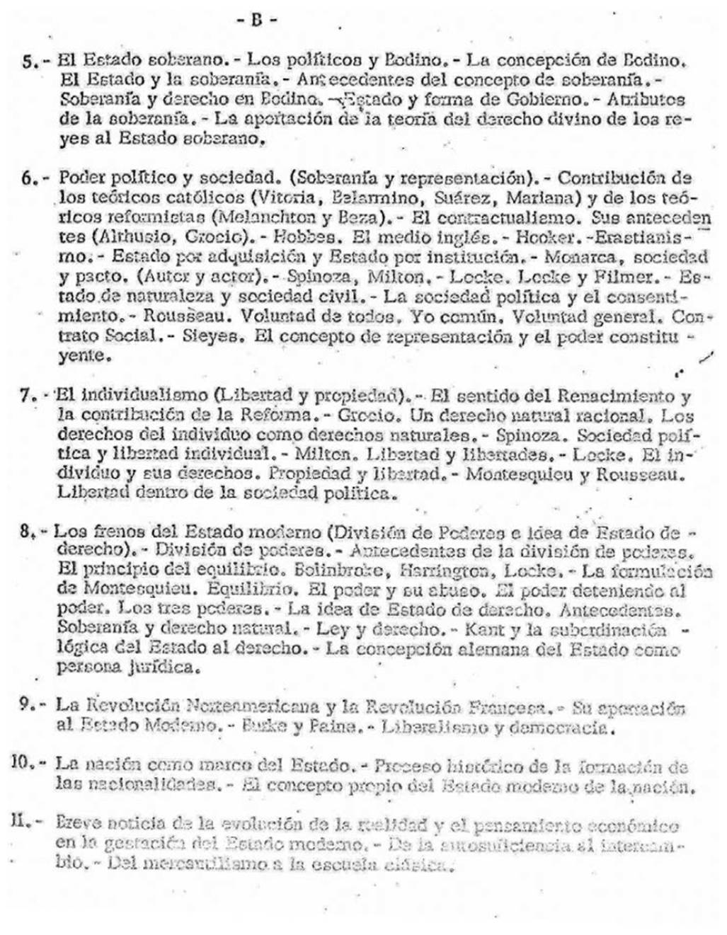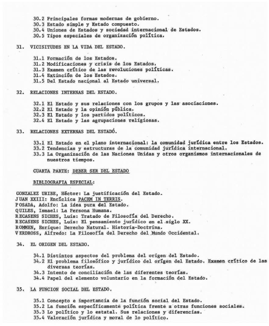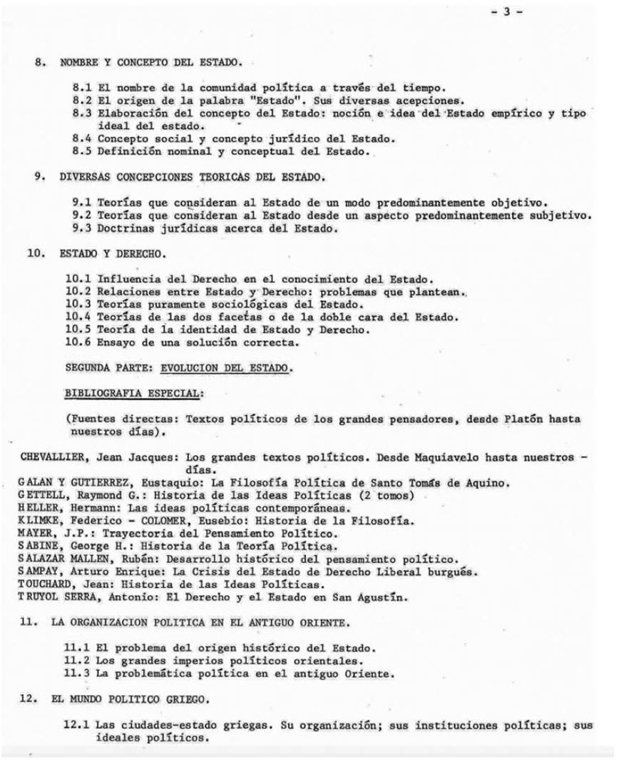 En la segunda parte de este breve ensayo reviso los temarios, programas o cuestionarios y bibliografía utilizados por académicos que profesaron la cátedra de Teoría del Estado en nuestra Universidad, con la esperanza que sean una referencia para quienes toman decisiones sobre los cambios en los programas de estudio. No omito decir que no pude tener acceso a algunos programas relevantes y que, de los encontrados, soy responsable de su selección.
