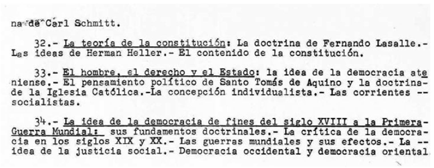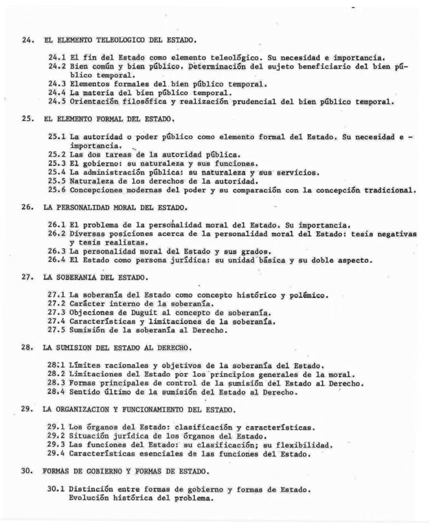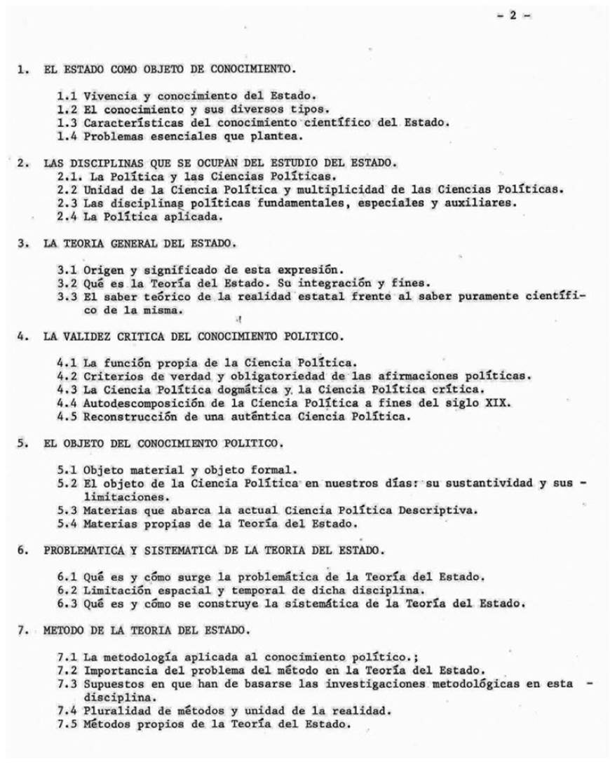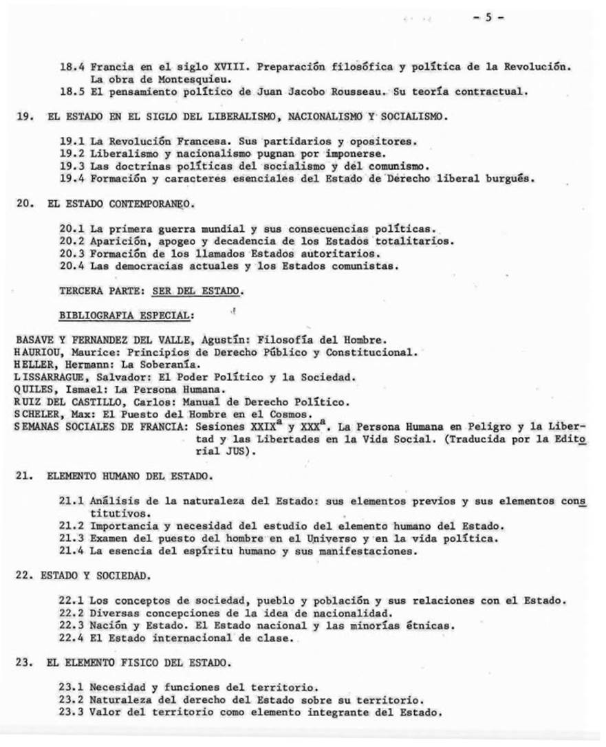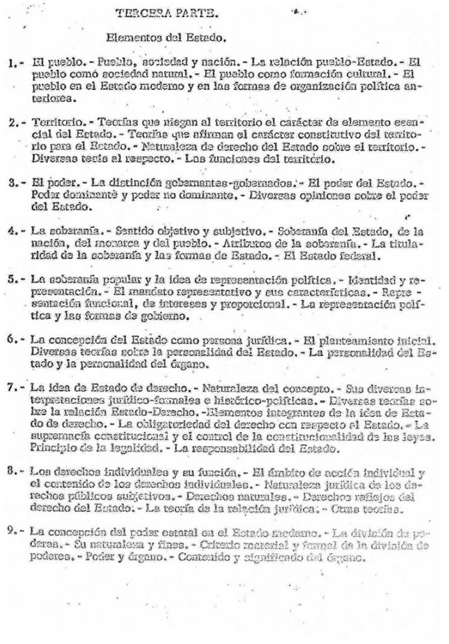 En la segunda parte de este breve ensayo reviso los temarios, programas o cuestionarios y bibliografía utilizados por académicos que profesaron la cátedra de Teoría del Estado en nuestra Universidad, con la esperanza que sean una referencia para quienes toman decisiones sobre los cambios en los programas de estudio. No omito decir que no pude tener acceso a algunos programas relevantes y que, de los encontrados, soy responsable de su selección.