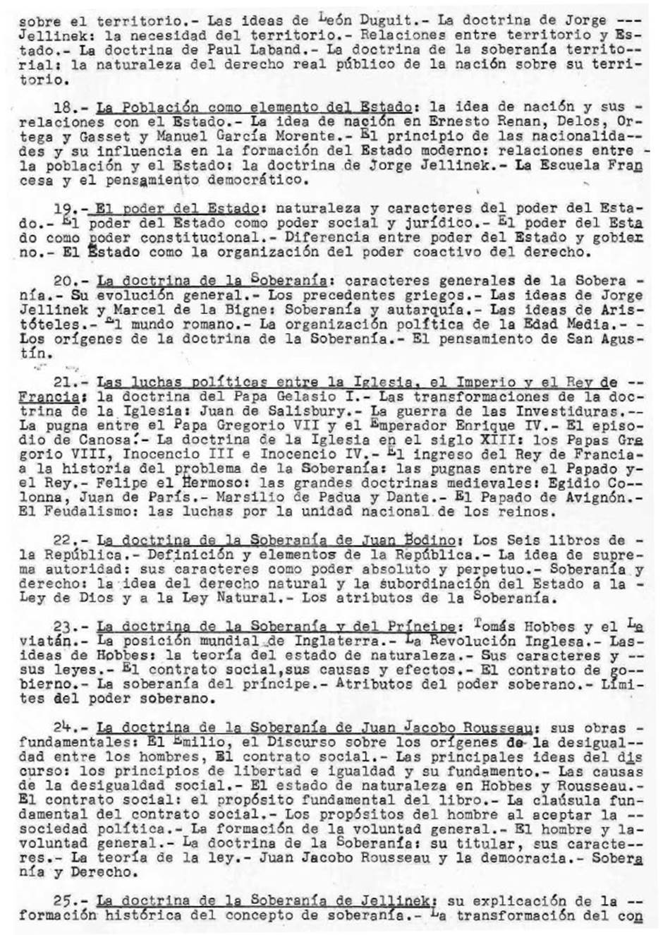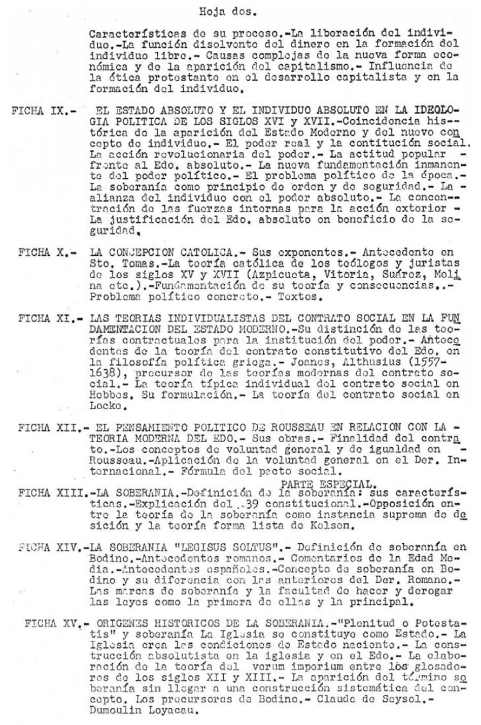 El documento que contiene el programa impartido por Don Manuel Pedroso en la Facultad de Derecho de nuestra Universidad lleva el título de Cuestionario de Teoría del Estado y consta de veintiún fichas, puntualizándose que son los temas elegidos para la prueba final del curso, todo lo que indica que los exámenes eran el instrumento para medir los conocimientos de los estudiantes. Hay un primer apartado denominado “Preliminares”, que consta de doce fichas y un segundo apartado denominado “Parte Especial” integrado por ocho fichas. En ese primer apartado se analizan temas tales como el Estado como la forma política de un pueblo, donde destaca la que corresponde a nuestra época y sus características. El Estado como fenómeno social, la heterogeneidad social del mismo como su supuesto. La naturaleza de las sociedades animales, objeto de las Ciencias naturales, objeto de la Ciencias del espíritu. La realidad del Estado. Los hombres autores y actores de su propia historia. La realidad de la vida social. El Estado y el Derecho. La concepción individualista del Estado. El concepto político del individuo y su génesis. El sentido revolucionario de la obra de Descartes: la ruptura con la tradición y el mundo medieval. Génesis económica: la aparición del capitalismo. El Estado y el individuo absolutos: coincidencia de la aparición del Estado moderno y la del nuevo concepto de individuo. La concepción católica. Las teorías individualistas del contrato social en la fundamentación del Estado moderno. El pensamiento político de Rousseau en relación con la teoría moderna del Estado. El segundo apartado consistente en la parte especial, destacan varias fichas dedicadas al tema de la soberanía, su definición, sus características, antecedentes romanos, españoles; Bodino y su concepto de soberanía. Orígenes históricos de la soberanía. La Iglesia constituida como Estado; la construcción absolutista en la Iglesia y en el Estado. La teoría de la soberanía en Bodino, en Hobbes, en Rousseau. Antecedentes de la teoría constitucionalista. Locke, Montesquieu. Teorías que niegan la soberanía como característica esencial del Estado. Teoría de la representación.