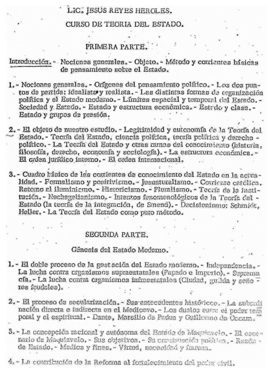 El curso de Teoría del Estado del Maestro Jesús Reyes Heroles está dividido en tres partes. La primera está dedicada a las nociones generales; al objeto de estudio, al tratar sobre la legitimidad y la autonomía de la Teoría del Estado y al cuadro básico de las corrientes de conocimiento del Estado en la actualidad. La segunda está dedicada a la génesis del Estado y versa sobre la lucha contra los poderes supraestatales: el Papado y el Imperio y contra los infra estatales: señores feudales, ciudades, etcétera. En cuanto al proceso de secularización, se funda en el estudio de las ideas de Dante, Marsilio de Padua, Guillermo de Occam. La concepción racional y autónoma sobre el Estado de Maquiavelo. La Reforma y su contribución al fortalecimiento del Poder Civil. El Estado, la soberanía y la teoría de Bodin o el tema del Poder político y la sociedad: la soberanía y la representación; los teóricos católicos, los reformistas, el contractualismo; Rousseau, Sieyès. El individualismo, libertad, propiedad; Locke. Los frenos del Estado moderno; La división de Poderes, su equilibrio; Montesquieu. El Estado de Derecho. Las revoluciones norteamericana y francesa. La Nación como marco del Estado. El pensamiento económico en la gestación del Estado moderno. La tercera parte se ocupa de los elementos del Estado: Territorio, Población, Poder. La soberanía, soberanía popular y representación política. La concepción del Estado como persona jurídica. La idea del Estado de Derecho. Los derechos individuales y su función. Y un último apartado dedicado a los órganos del Estado.