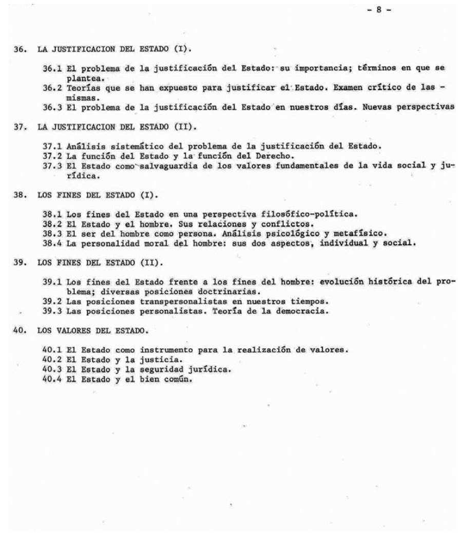 Debo enfatizar que la asignatura propuesta designada “Estado, Sociedad y Derecho” nunca fue pensada para sustituir a ninguna otra, sino que su inclusión era concebida como una adición en los programas de todas las carreras. Por razones diversas, la propuesta no llegó a ser considerada como estuvo concebida originalmente.