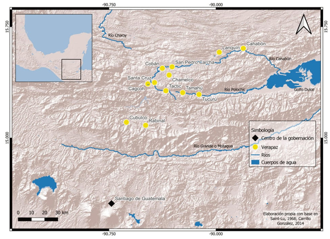 La que sería la provincia de la Verapaz estaba ubicada en los límites de la Audiencia de Guatemala, muy cercana a la selva lacandona, con la que antaño se comunicaba, gracias a la cuenca del río Usumacinta, por el norte. La vertiente del Caribe, con los ríos Polochic y Cahabón como sus mayores afluentes, atravesaba buena parte de la región. Además, estos últimos constituían los límites de importantes serranías: la de Minas y la de Chuacús, sólo separadas por el río Salamá. Rabinal -primero Tequicistlán- era considerada en el siglo XVI como puerta de entrada a Tezulutlán y por ello reducida desde finales de la década de los veinte de dicho siglo.6 Al oeste limitaba con la sierra de los Cuchumatanes, posterior asentamiento de la alcaldía mayor de Huehuetenango-Totonicapán.7 Antes del contacto europeo, había 208 000 habitantes aproximadamente, reducidos a 52 000 para mediados del siglo XVI.8 Al ser una región bisagra entre tierras bajas y tierras altas, la Verapaz era diversa en términos geográficos y económicos, pues resaltaba la producción de cacao, maíz, frijol, algodón y metales preciosos.9