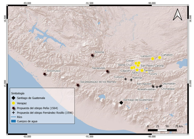 FUENTE: elaboración de Selvin Jerónimo Chiquín Enríquez con base en información proporcionada por André Saint-Lu en Espirit évangélique et colonisation (París: Centre de Recherches Hispaniques, Institut d’Études Hispaniques, 1968) y Juan Emilio Carrillo González, “Por los senderos de Tezulutlán. Los mayas y su búsqueda de la verdadera paz en tierra de confines, siglos XVI-XVIII” (tesis de doctorado, Centro de Investigaciones y Estudios de Antropología Social, 2014).