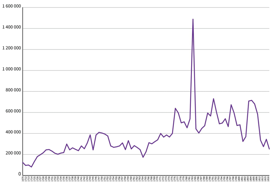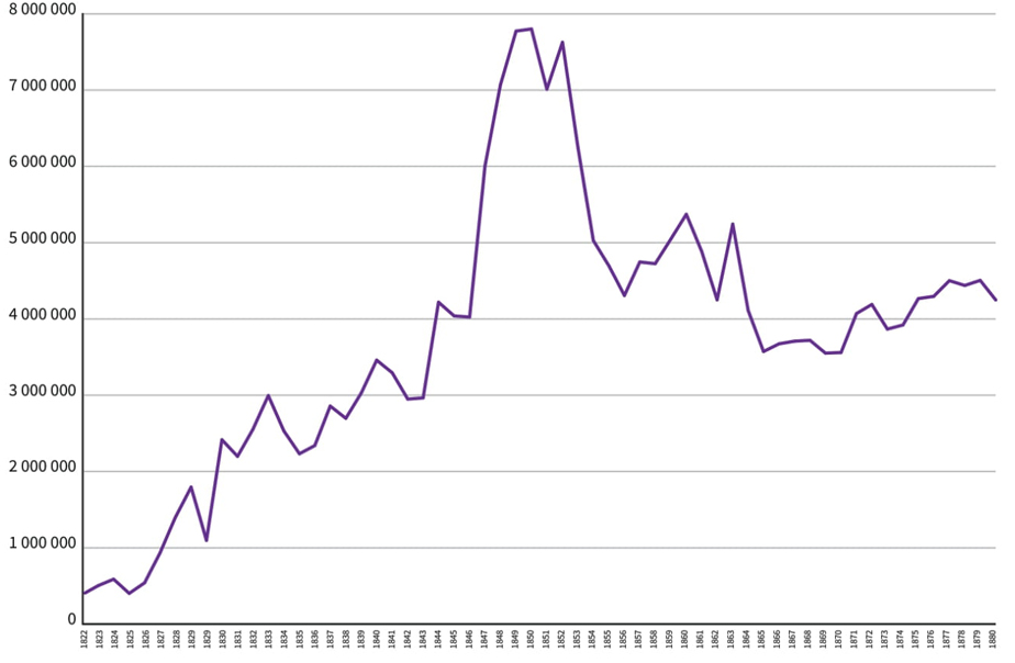 Desde la segunda mitad del siglo XVI, Guanajuato vivió un continuo desarrollo sobre la base de los descubrimientos de minas con distinta riqueza, los cuales permitieron que se consolidara una sólida base minero-metalúrgica, allegándose recursos agrícolas y ganaderos extendidos por todo el Bajío. Con poco más de 70 000 habitantes hacia el final del periodo virreinal,20 se experimentaron sonadas bonanzas que ponían a Guanajuato a la cabeza de la producción minera. La más notable fue la de la mina Valenciana, que puede apreciarse en la gráfica 1.