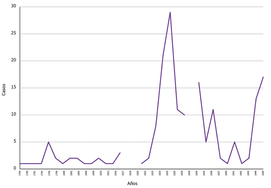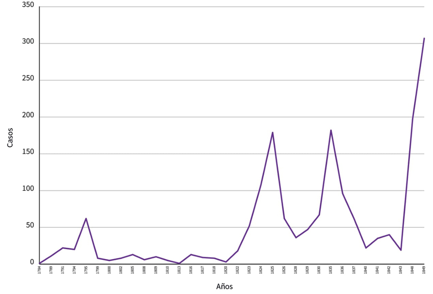 La gráfica 3 muestra el comportamiento de los registros totales de las actividades reportadas en la Diputación de Minería de Guanajuato entre 1784 y 1849, basados en el número total de expedientes, con un incremento entre 1794 y 1795 que empata con el auge de la mina Valenciana y con alzas fluctuantes a partir de 1823.