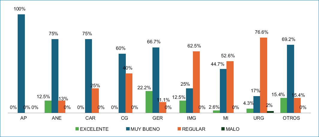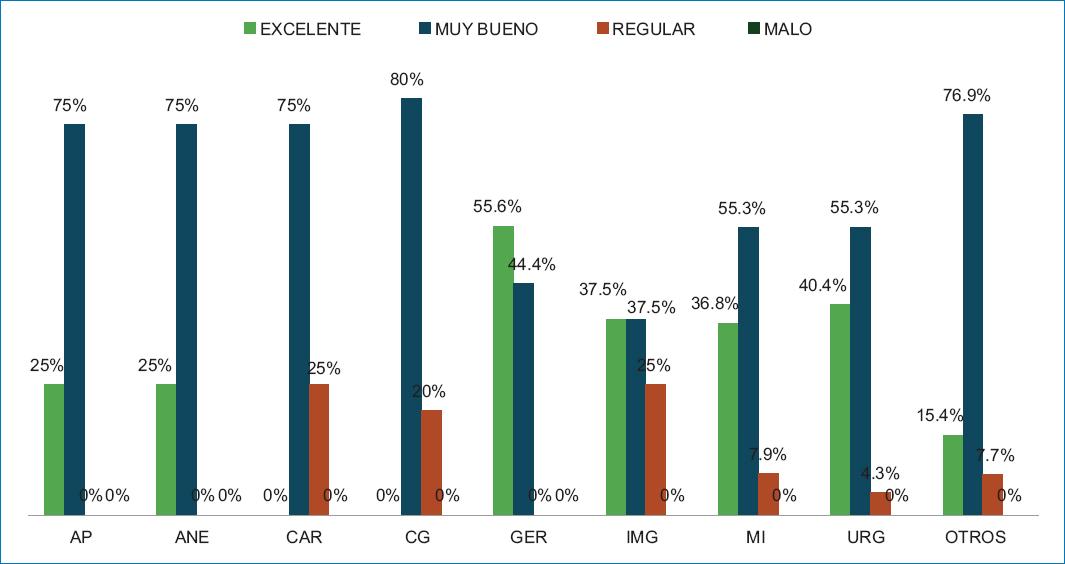 Las calificaciones después de la intervención educativa fueron: 46 (32.62%) residentes puntuaron Excelente, 84 (59.57%) Muy bueno, 11 (7.80%) Regular y ninguno Malo. Las frecuencias por especialidad se muestran en la figura 2.