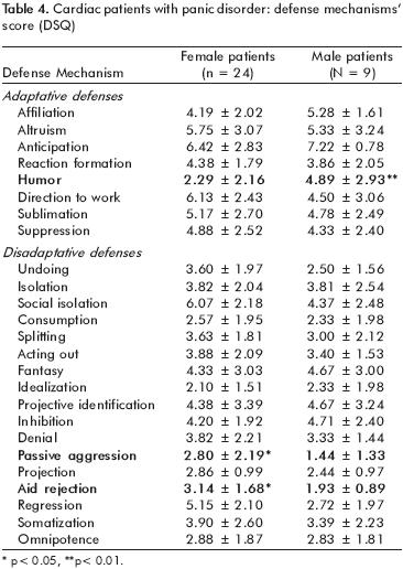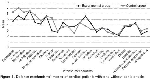 Within the group of cardiac patients with panic attack, 72.73% were female patients and 27.27% male, with an average age of 38.52 ± 14.18 years and 5.73 ± 2.75 years of schooling. The group of cardiac patients used as control was formed by 30 subjects also in its majority female (56.7%), with an age of 45.27 ± 14.51 years and an average of 5.67 ± 3.31 years of schooling. The patients of the group with panic disorder had higher levels of anxiety and used more maladaptive defense mechanisms, such as social isolation and inhibition, tended to use more somatization and less the adaptive defenses (suppression, work orientation, sublimation, affiliation and humor), in comparison to the group without mental disorder. The criteria for panic disorder (DSMIV) correlated directly with somatization; the ones from major depression correlated directly with regression and inversely with humor and socioeconomical level; the score in Hamilton's Anxiety Scale with maladaptive defenses as social isolation, acting out and somatization; the SCL90 with the maladaptive defenses acting out, projection and regression. The multiple regression analysis determined that regression and somatization contributed to the panic disorder symptomatology, and leads to major depressive disorder; projection, somatization and social isolation to anxiety's intensity and reaction formation, humor, regression, fantasy, inhibition, projective identification, passive aggression and omnipotence in general to the psychiatric symptoms.