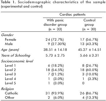 The group of cardiac patients with panic disorder (n=33) was constituted by 24 female patients (72.73%) and 9 men (27.27%), with an average age of 38.52 ± 14.18 years and 5.73 ± 2.75 school years. Most belonged to socioeconomic class 2 (n=18, 54.5%) and to catholic religion (n=31, 93.9%).