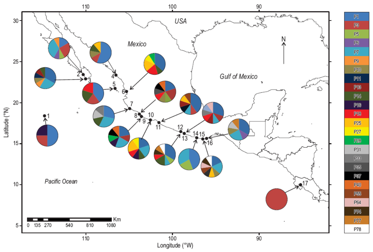 No es clara la relación entre la estructura filogeográfica y el tipo de larva (y su duración); sin embargo, la ausencia de estructura genética en nuestra área de estudio, a lo largo del Pacífico mexicano, puede estar relacionada con las corrientes oceánicas, lo cual apunta hacia la hipótesis del efecto fundador. Las corrientes fluyen hacia mar adentro la mayor parte del año alrededor de la isla Clarión, donde la población presentó diferencias con 6 de las poblaciones mexicanas estudiadas. Otro ejemplo es la corriente que corre desde Oaxaca hasta Nayarit y regresa a Oaxaca (Kessler 2006), que puede mantener en contacto las poblaciones de esa parte de la costa mexicana del Pacífico.