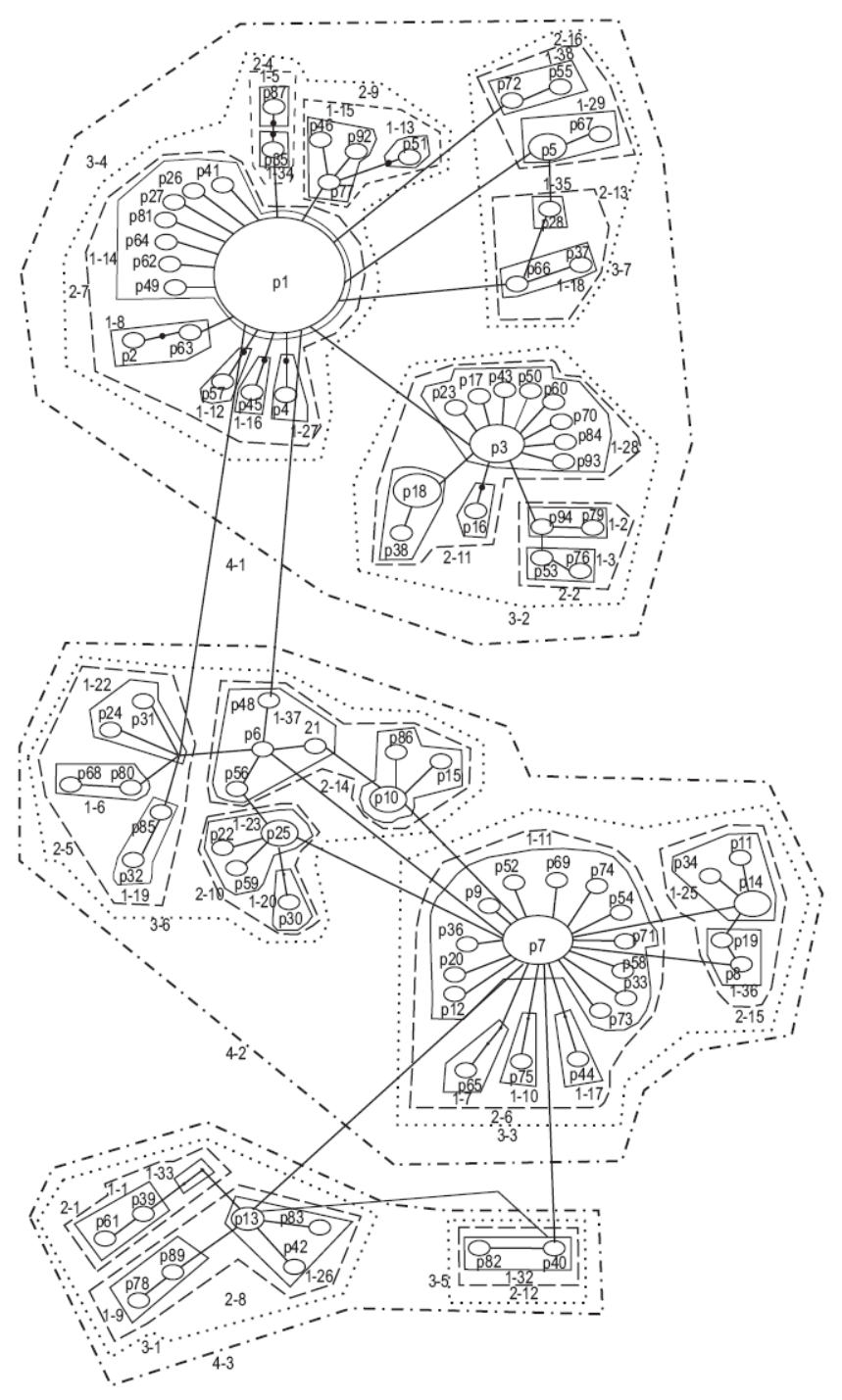 El NCA para P. pansa mostró cuatro niveles presentes en la red de haplotipos (Fig. 2). De los 92 haplotipos, 38 fueron clados de primer nivel, 16 de segundo nivel, 7 de tercer nivel, 3 de cuarto nivel y 1 de quinto nivel. Tres de los clados presentaron flujo de genes restringido con aislamiento por distancia; éstos fueron 1-11, 2-11 y 3-3. La red de haplotipos en general mostró expansión contigua.