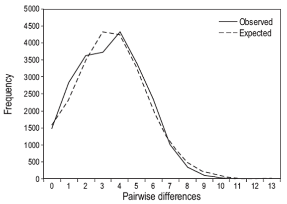 inicial y final, así como valores de T. Estos parámetros fueron necesarios para correr el modelo de crecimiento-declive de la población implementado en Arlequin 3.11 (Excoffier et al. 2005). Calculamos el índice de irregularidad (raggedness) de Harpending para probar el ajuste de los datos del análisis de diferencias pareadas.