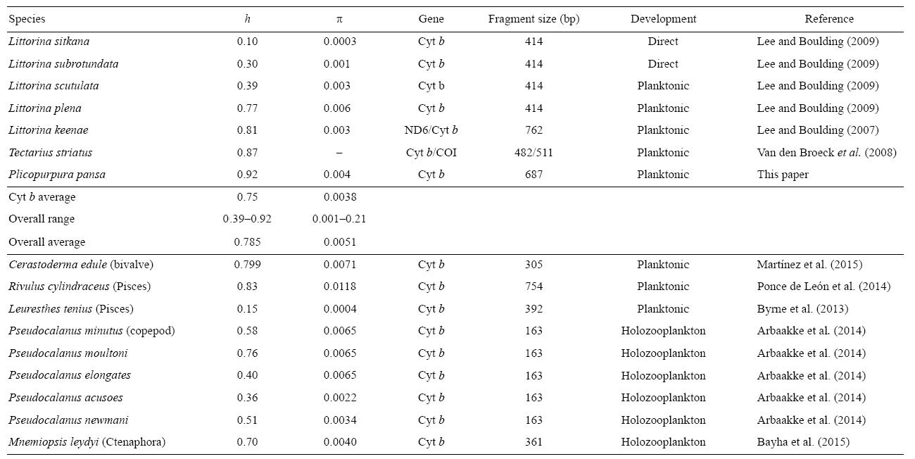 Key words: cytochrome b; haplotype diversity; nucleotide diversity; Muricidae; Plicopurpura pansa